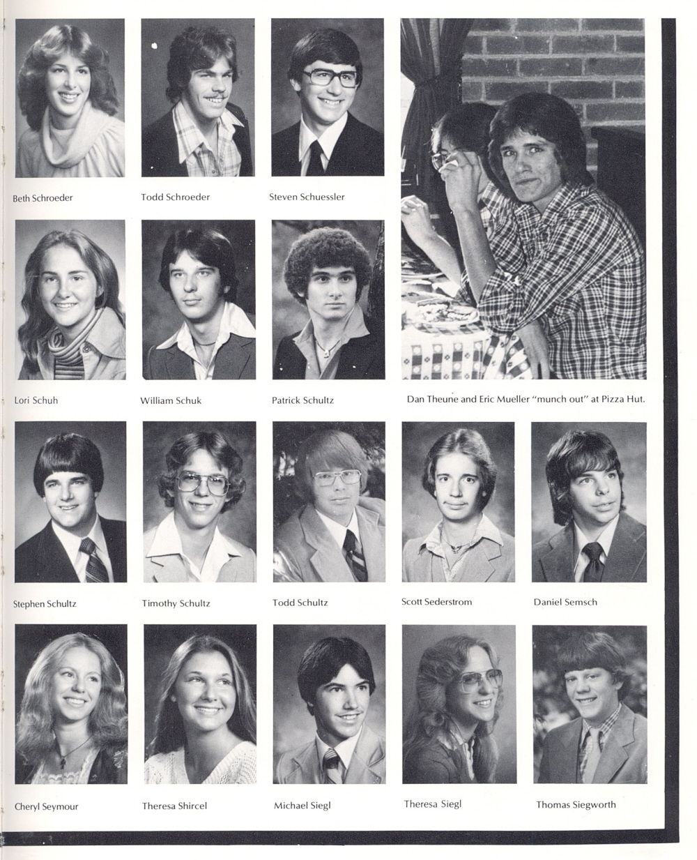 1980 Sheboygan South High School, Page 45: Beth Schroeder, Todd Schroeder, Steven Schuessler, Lori Schuh, William Schuk, Patrick Schultz, Stephen Schultz, Timothy Schultz, Todd Schultz, Scott Sederstrom, Daniel Semsch, Cheryl Seymour, Theresa Shircel, Michael Siegl, Theresa Siegl, Thomas Siegworth.
