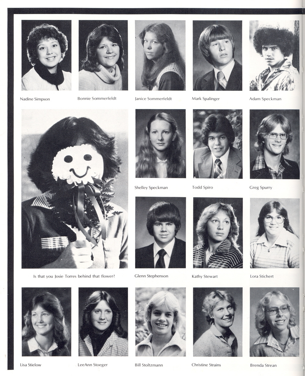 1980 Sheboygan South High School, Page 46: Nadine Simpson, Bonnie Sommerfeldt, Janice Sommerfeldt, Mark Spalinger, Adam Speckman, Shelley Speckman, Todd Spiro, Greg Spurry, Glenn Stephenson, Kathy Stewart, Lora Stichert, Lisa Stielow, LeeAnn Stoeger, Bill Stoltzmann, Christine Strains, Brenda Strean.
