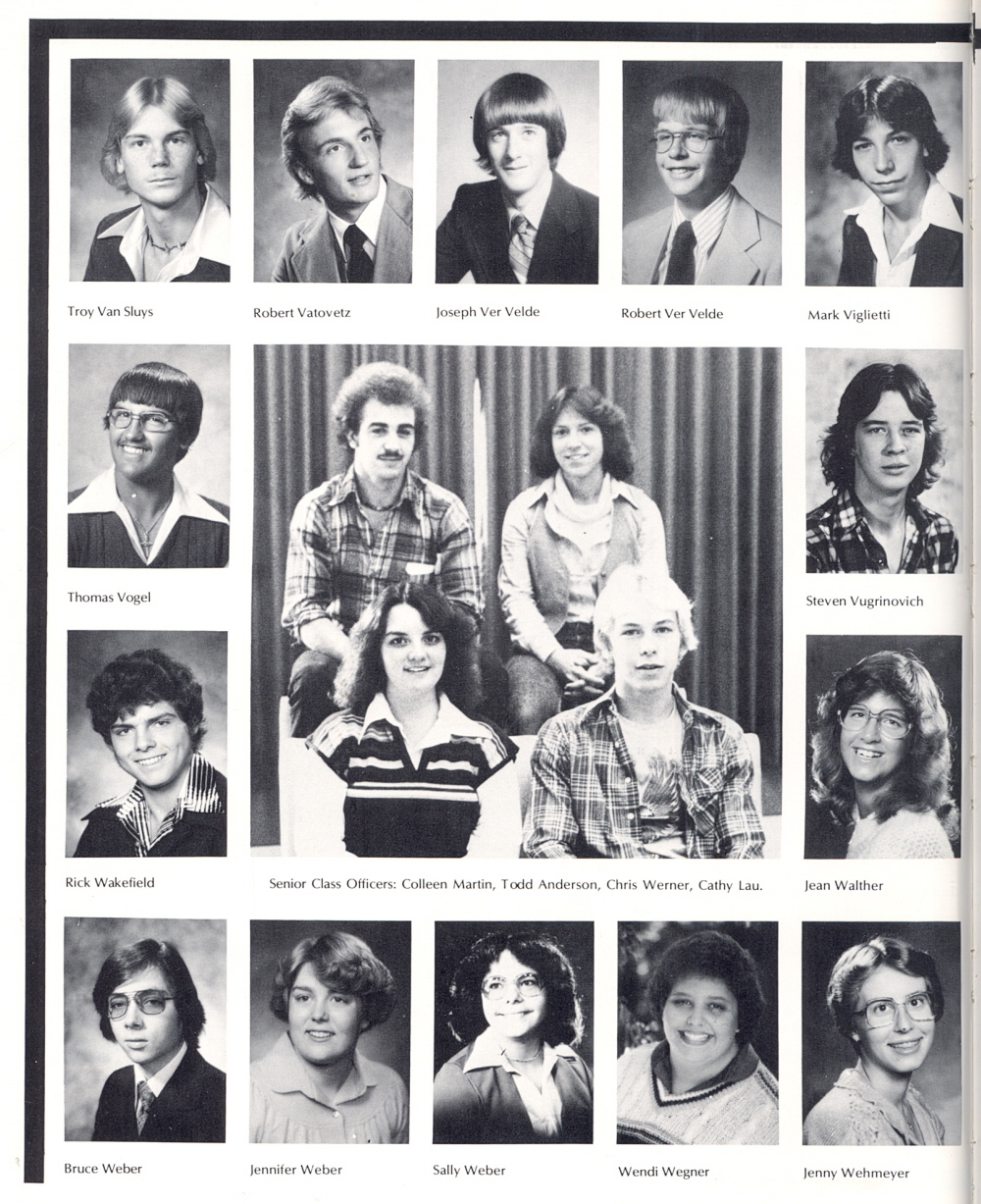 1980 Sheboygan South High School, Page 50: Troy Van Sluys, Robert Vatovetz, Joseph Ver Velde, Robert Ver Velde, Mark Viglietti, Thomas Vogel, Steven Vugrinovich, Rick Wakefield, Jean Walther, Bruce Weber, Jennifer Weber, Sally Weber, Wendi Wegner, Jenny Wehmeyer.