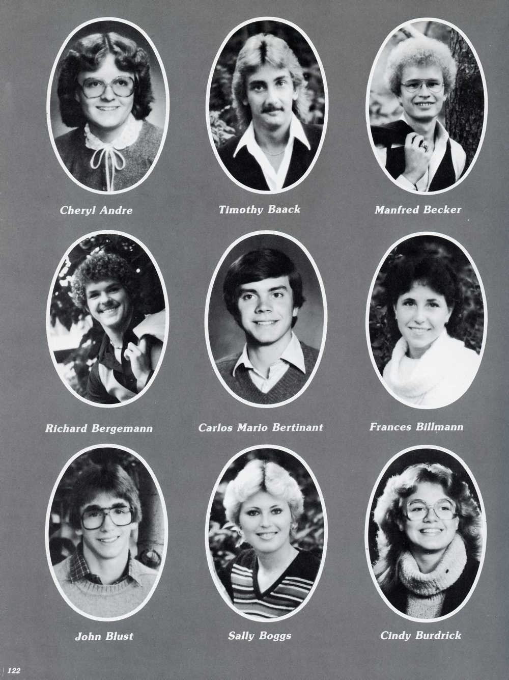 1981 Sheboygan Falls High School Yearbook, page 122: Cheryl Andre, Timothy Baack, Manfred Becker, Richard Bergemann, Carols Mario Bertinant, Frances Billmann, John Blust, Sally Boggs, Cindy Burdrick.