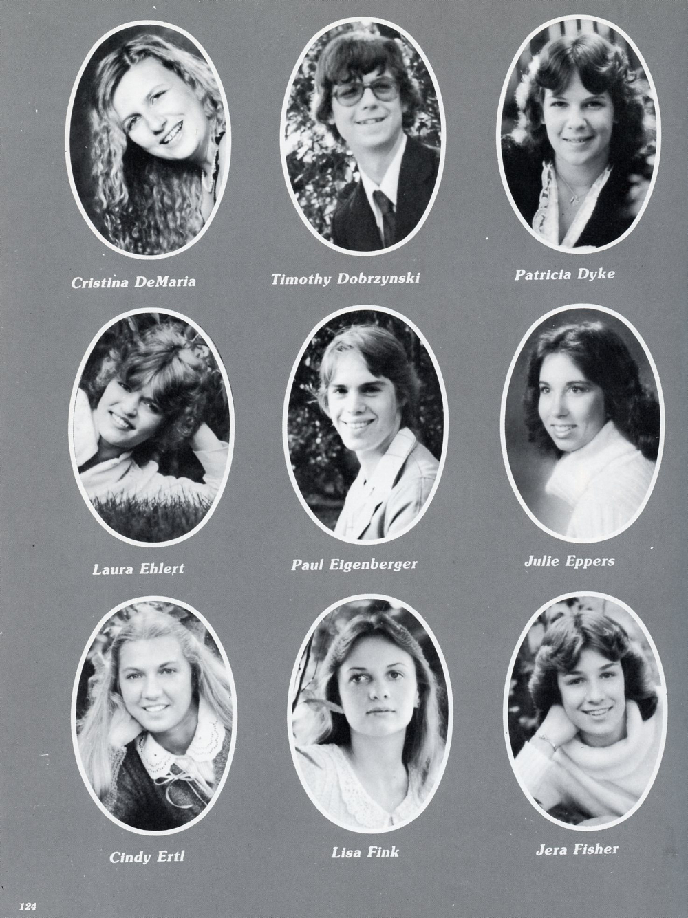 1981 Sheboygan Falls High School Yearbook, page 124: Cristina DeMaria, Timothy Dobrzynski, Patricia Dyke, Laura Ehlert, Paul Eigenberger, Julie Eppers, Cindy Ertl, Lisa Fink, Jera Fisher.