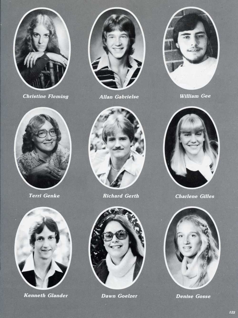 1981 Sheboygan Falls High School Yearbook, page 125: Christine Fleming, Allan Gabrielse, William Gee, Terri Genke, Richard Gerth, Charlene Gilles, Kenneth Glander, Dawn Goelzer, Denise Gosse.