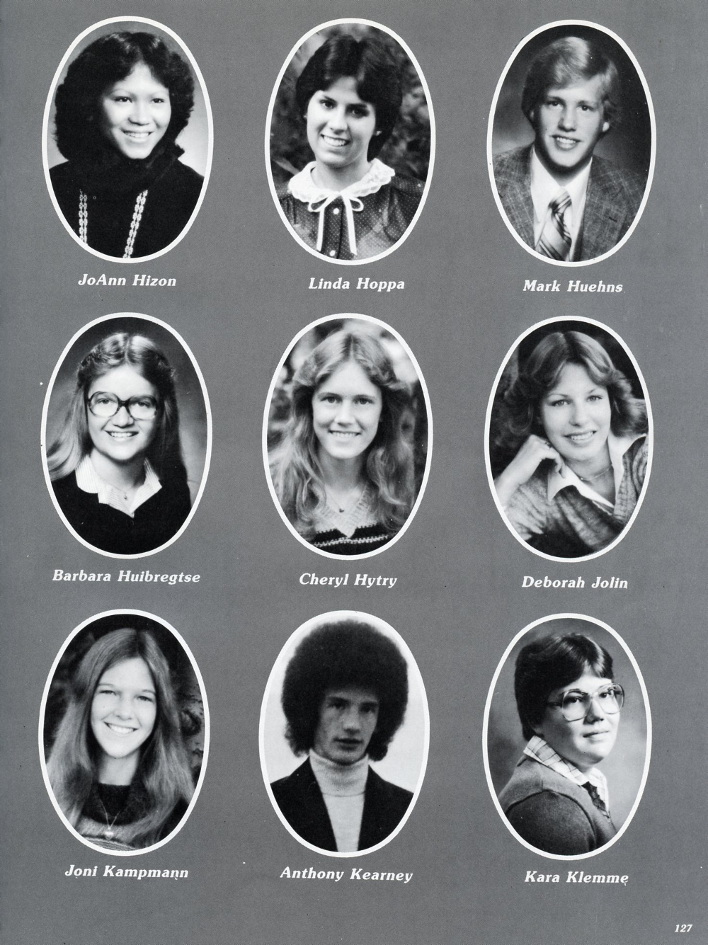 1981 Sheboygan Falls High School Yearbook, page 127: JoAnn Hizon, Linda Hoppa, Mark Huehns, Barbara Huibregtse, Cheryl Hytry, Deborah Jolin, Joni Kampmann, Anthony Kearney, Kara Klemme.