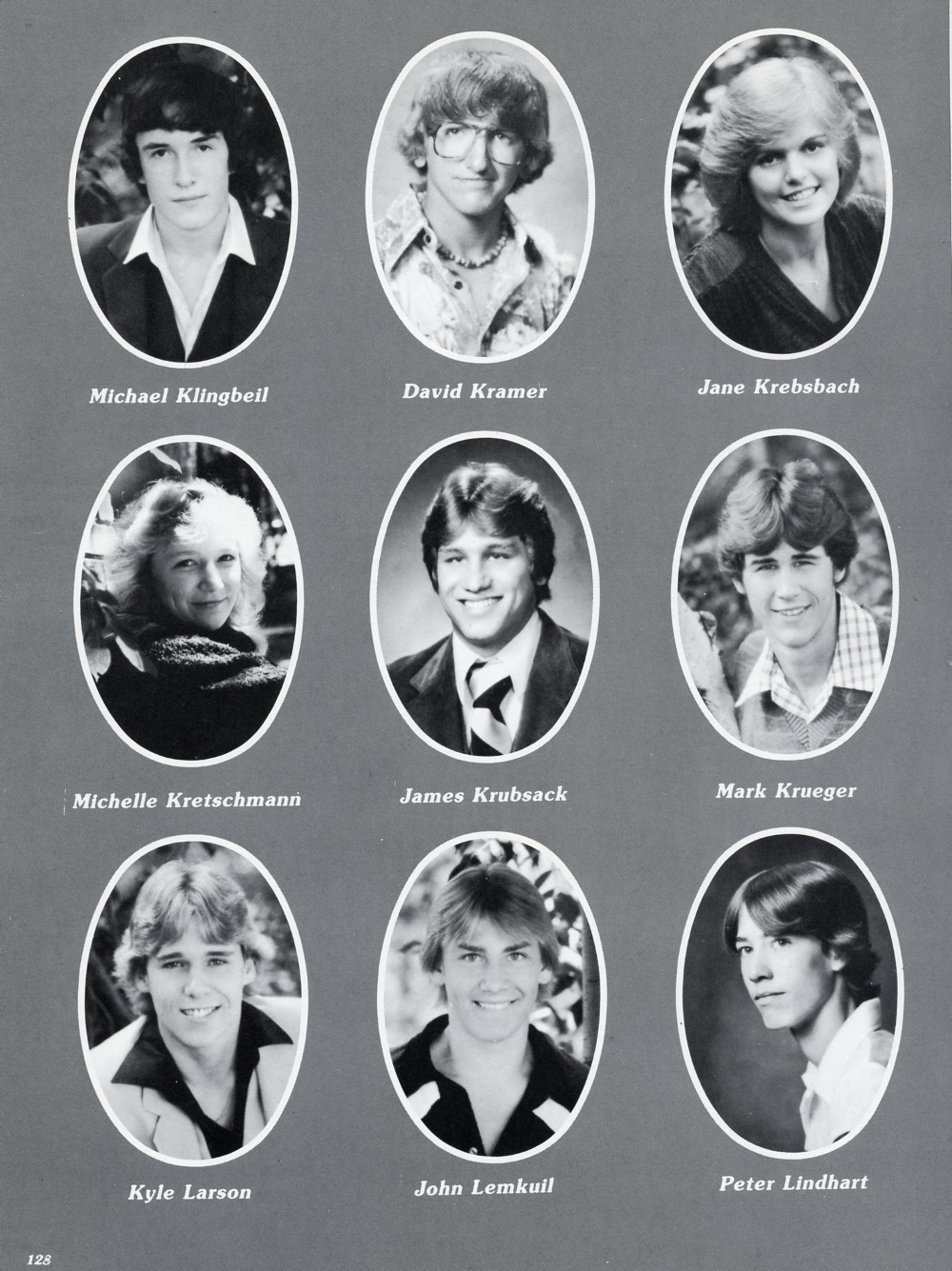 1981 Sheboygan Falls High School Yearbook, page 128: Michael Klingbeil, David Kramer, Jane Krebsbach, Michelle Kretschmann, James Krubsack, Mark Krueger, Kyle Larson, John Lemkuil, Peter Lindhart.