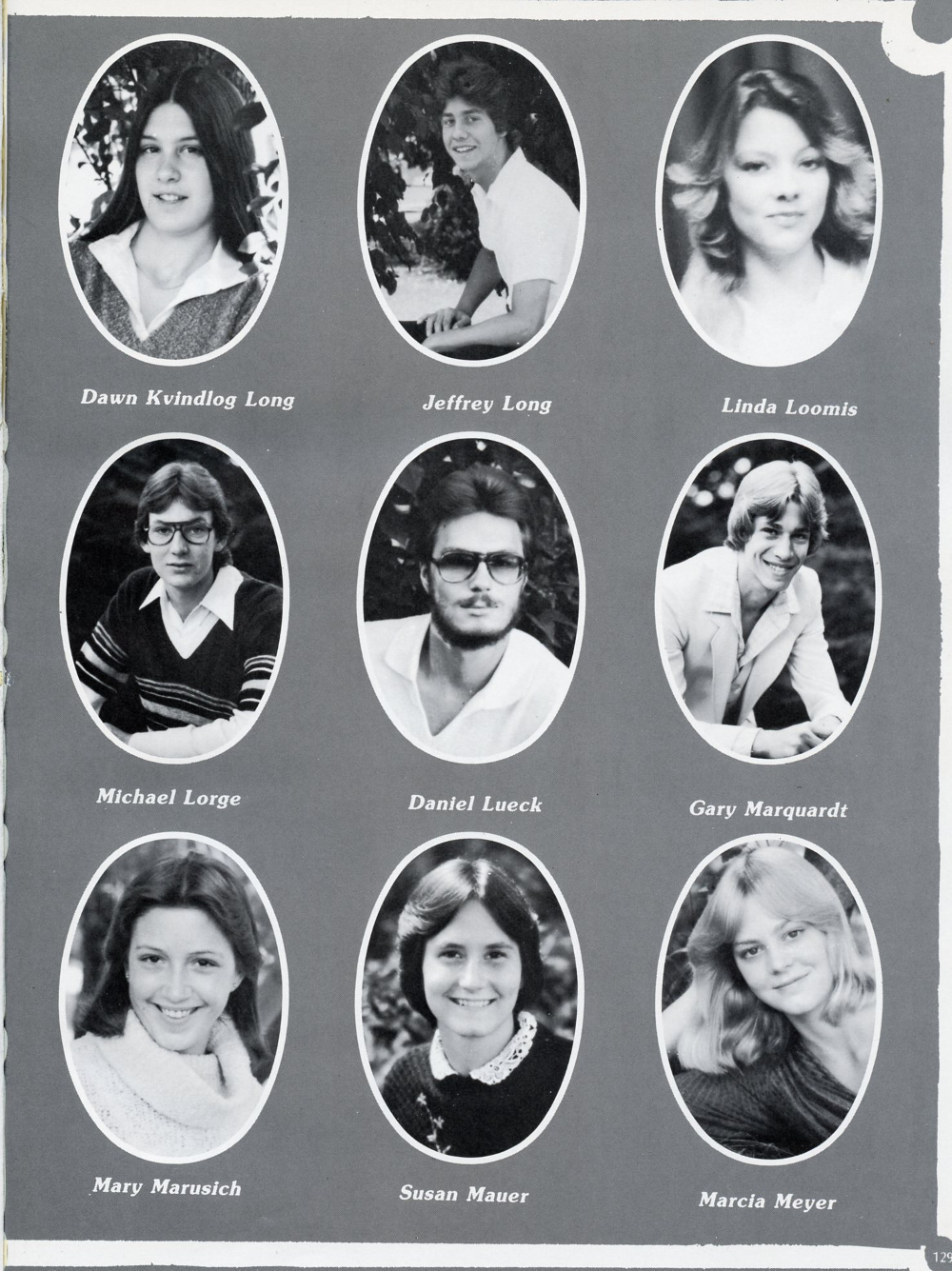 1981 Sheboygan Falls High School Yearbook, page 129: Dawn Kvindlog Long, Jeffrey Long, Linda Loomis, Michael Lorge, Daniel Lueck, Gary Marquardt, Mary Marusich, Susan Mauer, Marcia Meyer.