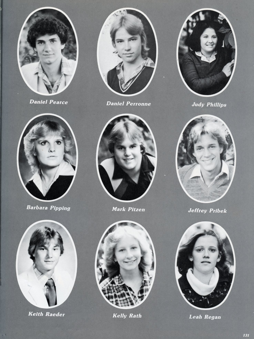 1981 Sheboygan Falls High School Yearbook, page 131: Daniel Pearce, Daniel Perronne, Judy Phillips, Barbara Pipping, Mark Pitzen, Jeffrey Pribek, Keith Raeder, Kelly Rath, Leah Regan.