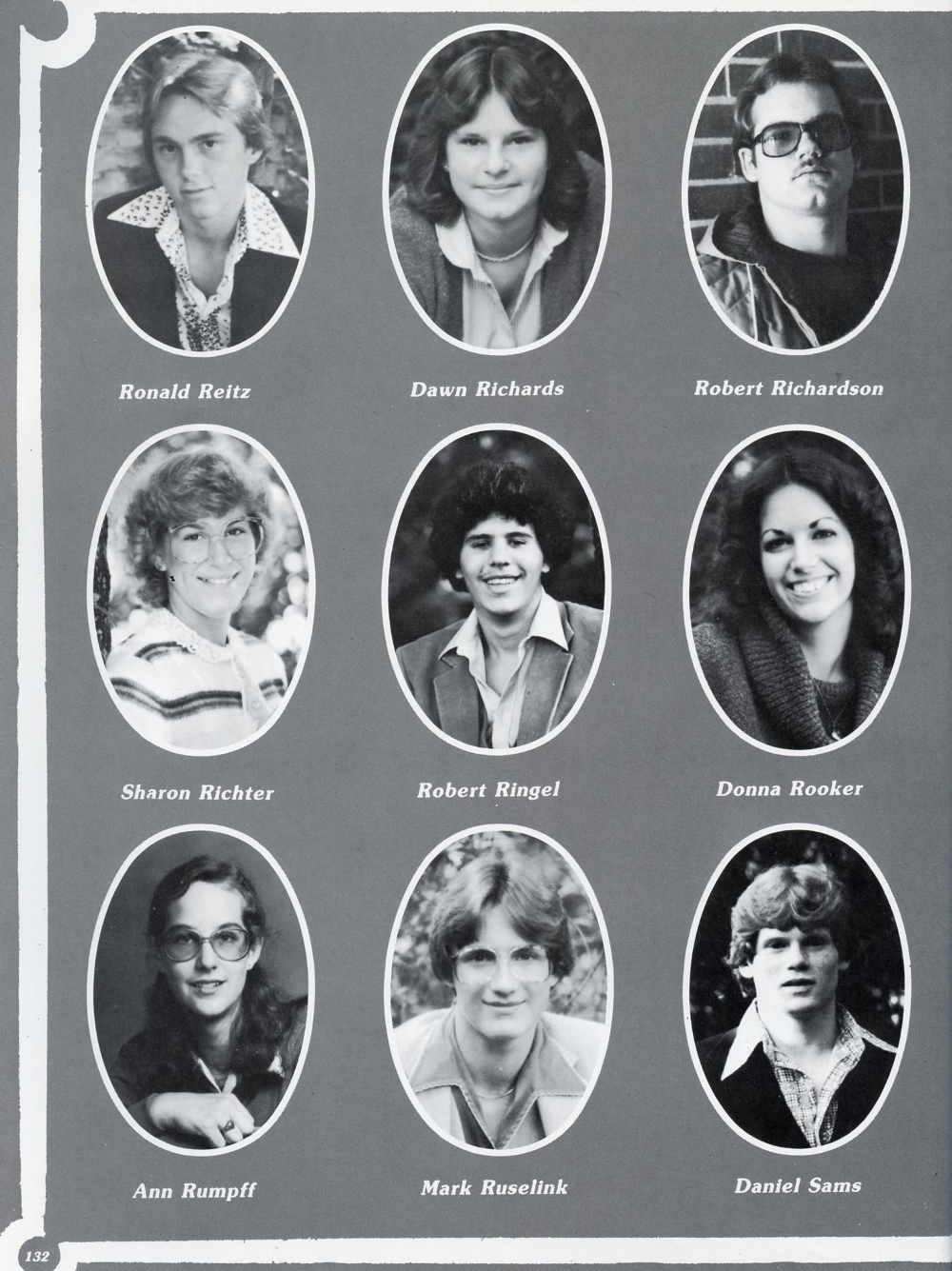 1981 Sheboygan Falls High School Yearbook, page 132: Ronald Reitz, Dawn Richards, Robert Richardson, Sharon Richter, Robert Ringel, Donna Rooker, Ann Rumpff, Mark Ruselink, Daniel Sams.
