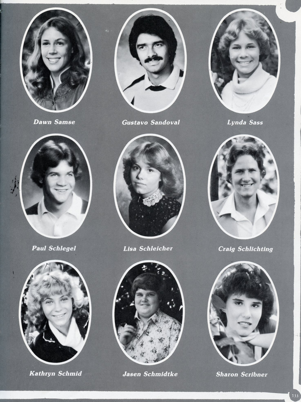1981 Sheboygan Falls High School Yearbook, page 133: Dawn Samse, Gustavo Sandoval, Lynda Sass, Paul Schlegel, Lisa Schleicher, Craig Schlichting, Kathryn Schmid, Jasen Schmidtke, Sharon Scribner.