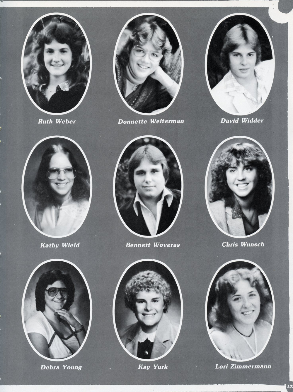 1981 Sheboygan Falls High School Yearbook, page 137: Ruth Weber, Donnette Weiterman, David Widder, Kathy Wield, Bennett Woveras, Chris Wunsch, Debra Young, Kay Yurk, Lori Zimmermann.