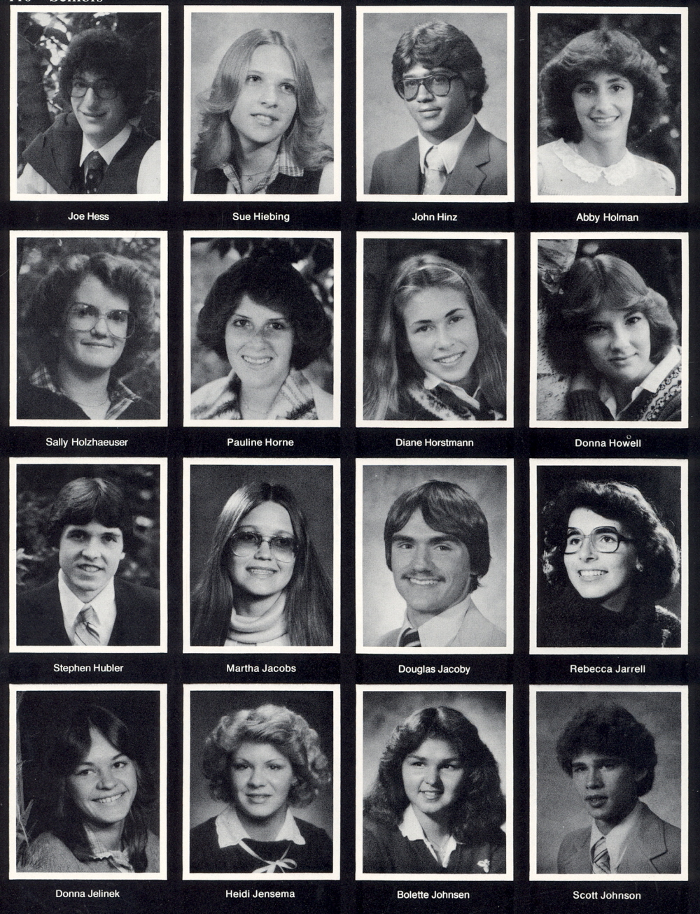 1981 Sheboygan North High School, Page 110. Joe Hess, Sue Hiebing, John Hinz, Abby Holman, Sally Holzhaeuser, Pauline Horne, Diane Horstmann, Donna Howell, Stephen Hubler, Martha Jacobs, Douglas Jacoby, Rebecca Jarrell, Donna Jelinek, Heidi Jensema, Bolette Johnsen, Scott Johnson.