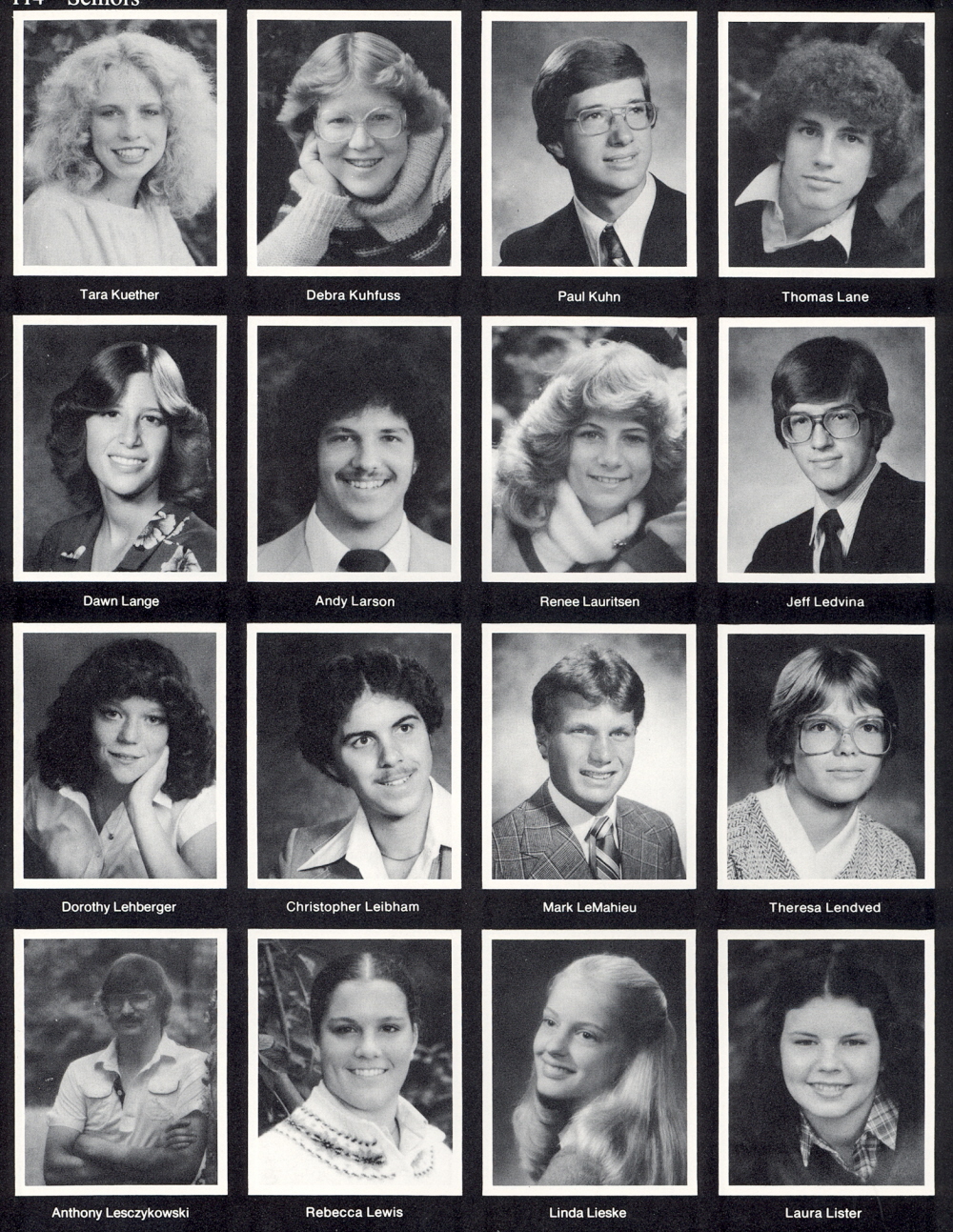 1981 Sheboygan North High School, Page 114. Tara Kuether, Debra Kuhfuss, Paul Kuhn, Thomas Lane, Dawn Lange, Andy Larson, Renee Lauritsen, Jeff Ledvina, Dorothy Lehberger, Christopher Leibham, Mark LeMahieu, Theresa Lendved, Anthony Lesczykowski, Rebecca Lewis, Linda Lieske, Laura Lister.