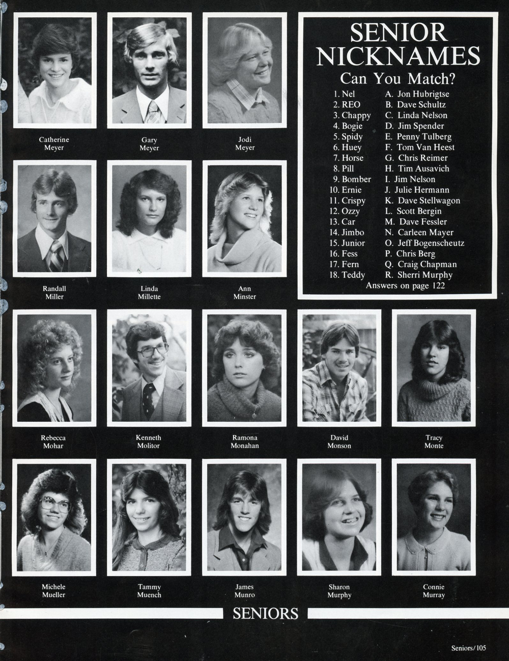 1981 Sheboygan South High School, Page 105: Catherine Meyer, Gary Meyer, Jodi Meyer, Randall Miller, Linda Millette, Ann Minster, Rebecca Mohar, Kenneth Molitor, Ramona Monahan, David Monson, Tracy Monte, Michele Mueller, Tammy Muench, James Munro, Sharon Murphy, Connie Murray.