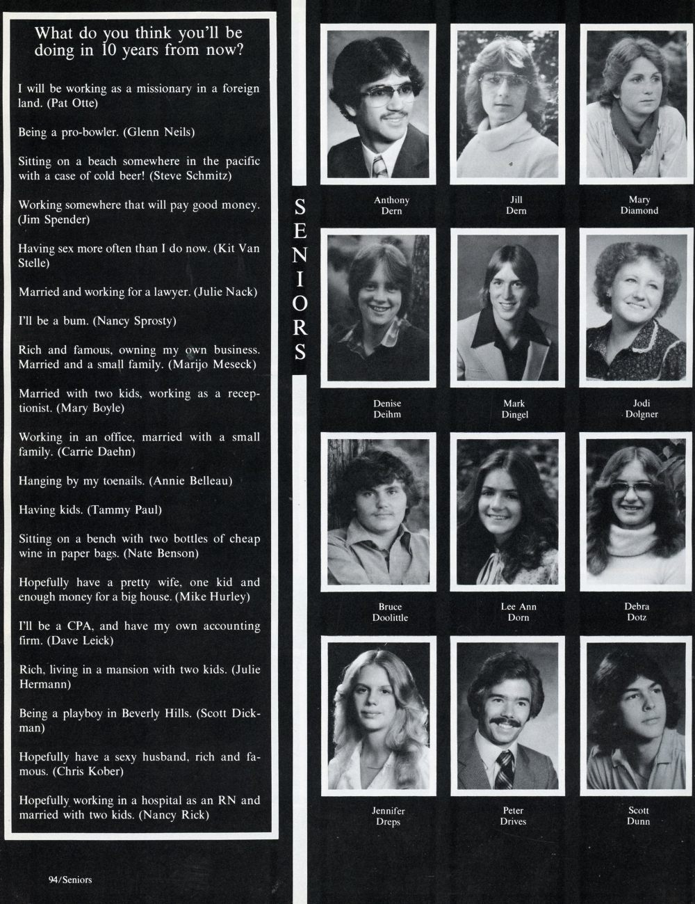 1981 Sheboygan South High School, Page 94: Anthony Dern, Jill Dern, Mary Diamond, Denise Deihm, Mark Dingel, Jodi Dolgner, Bruce Doolittle, Lee Ann Dorn, Debra Dotz, Jennifer Dreps, Peter Drives, Scott Dunn.