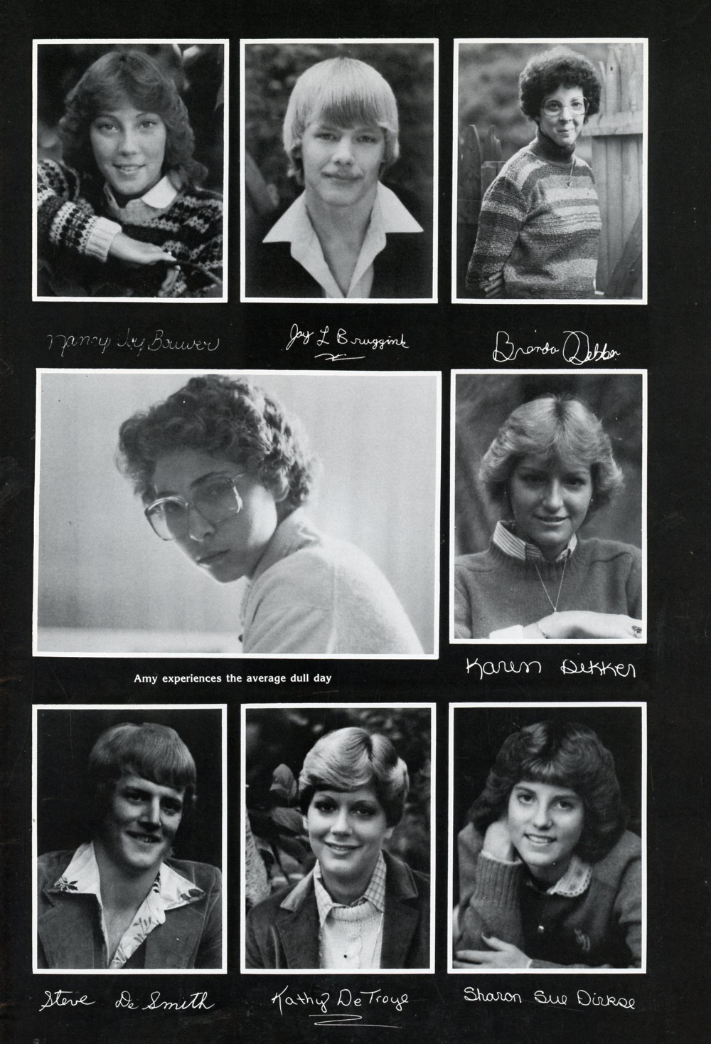 1982 Sheboygan County Christian High School, Page 15: Nancy Joy Bouwer, Jay L. Bruggink, Brenda Dekker, Karen Dekker, Steve De Smith, Kathy De Troye, Sharon Sue Dirkse.