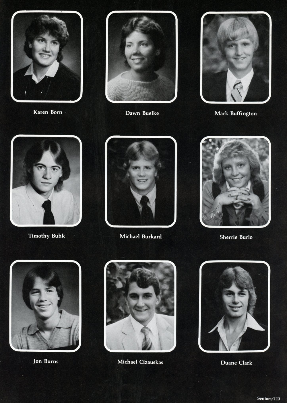 1982 Sheboygan Falls High School Yearbook, page 113: Karen Born, Dawn Buelke, Mark Buffington, Timothy Buhk, Michael Burkard, Sherrie Burlo, Jon Burns, Michael Cizauskas, Duane Clark.