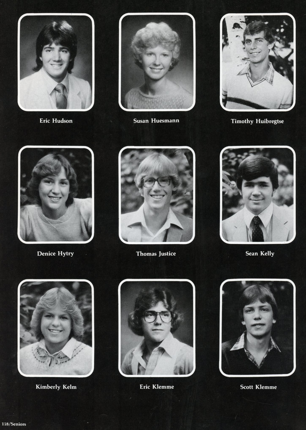 1982 Sheboygan Falls High School Yearbook, page 118: Eric Hudson, Susan Huesmann, Timothy Huibregtse, Denice Hytry, Thomas Justice, Sean Kelly, Kimberly Kelm, Eric Klemme, Scott Klemme.