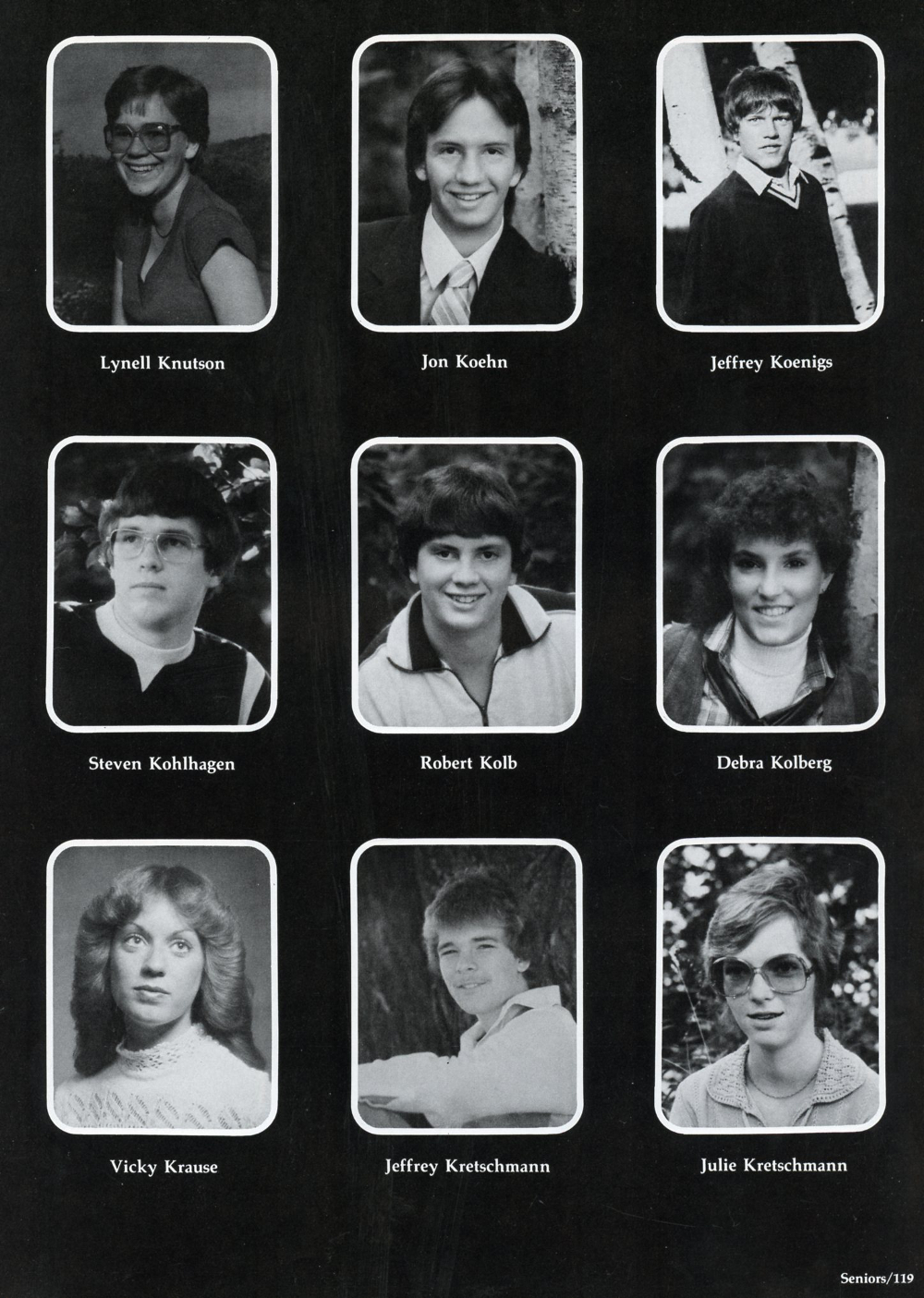 1982 Sheboygan Falls High School Yearbook, page 119: Lynell Knutson, Jon Koehn, Jeffrey Koenigs, Steven Kohlhagen, Robert Kolb, Debra Kolberg, Vicky Krause, Jeffrey Kretschmann, Julie Kretschmann.