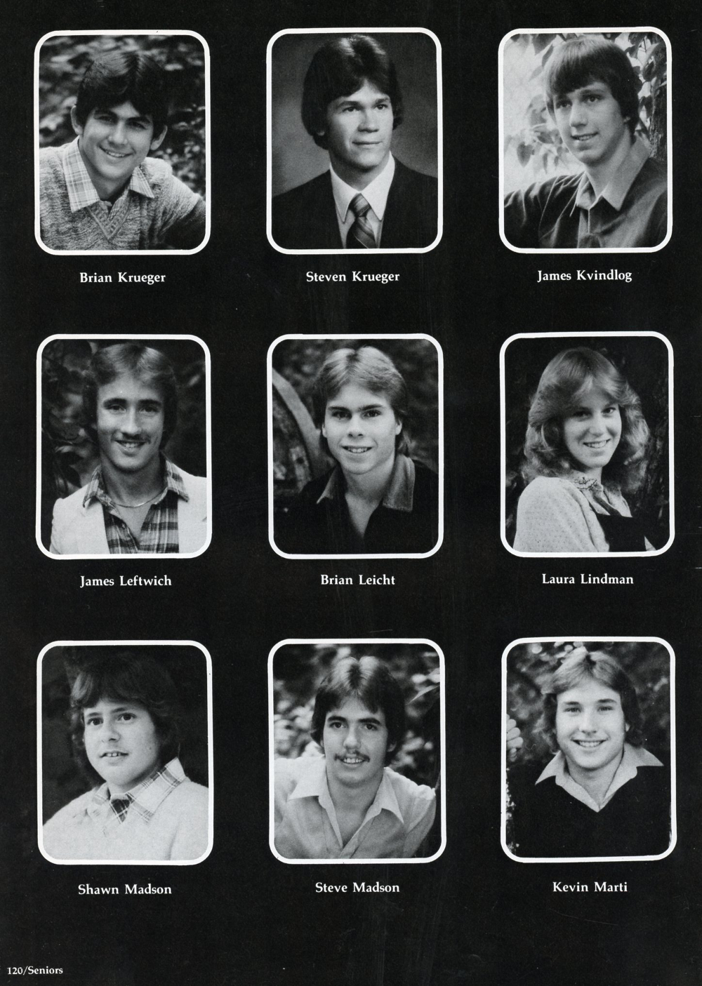 1982 Sheboygan Falls High School Yearbook, page 120: Brian Krueger, Steven Krueger, James Kvindlog, James Leftwich, Brian Leicht, Laura Lindman, Shawn Madson, Steve Madson, Kevin Marti.
