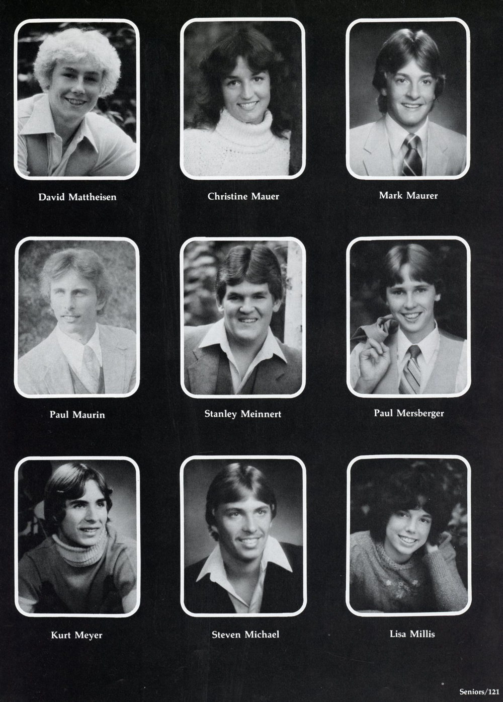 1982 Sheboygan Falls High School Yearbook, page 121: David Mattheisen, Christine Mauer, Mark Mauer, Paul Maurin, Stanley Meinnert, Paul Mersberger, Kurt Meyer, Steven Michael, Lisa Millis.