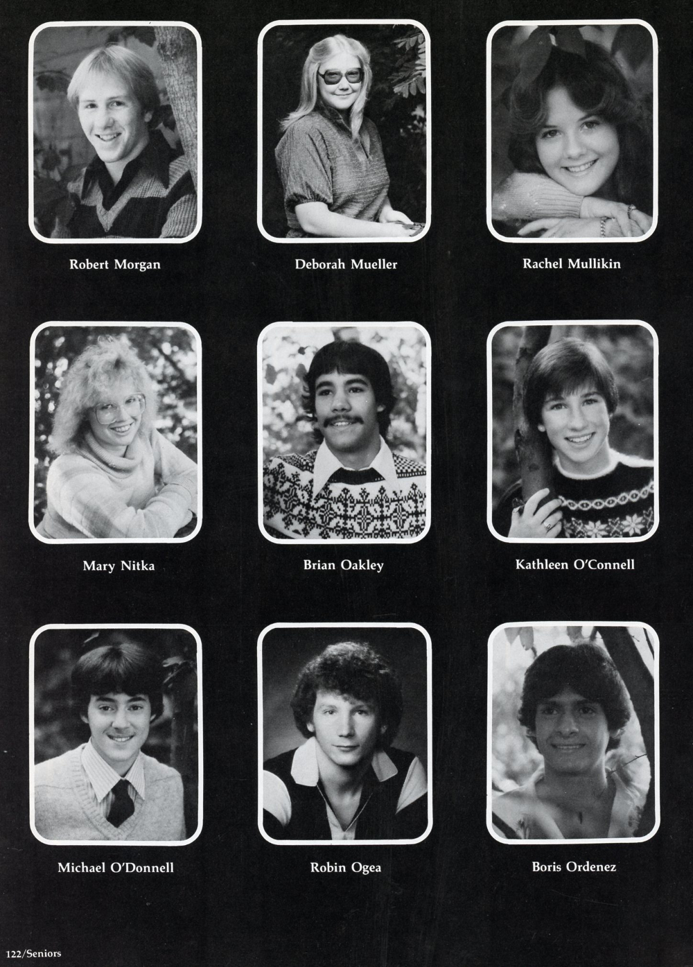 1982 Sheboygan Falls High School Yearbook, page 122: Robert Morgan, Deborah Mueller, Rachel Mullikin, Mary Nitka, Brian Oakley, Kathleen O'Connell, Michael O'Donnell, Robin Ogea, Boris Ordenez.
