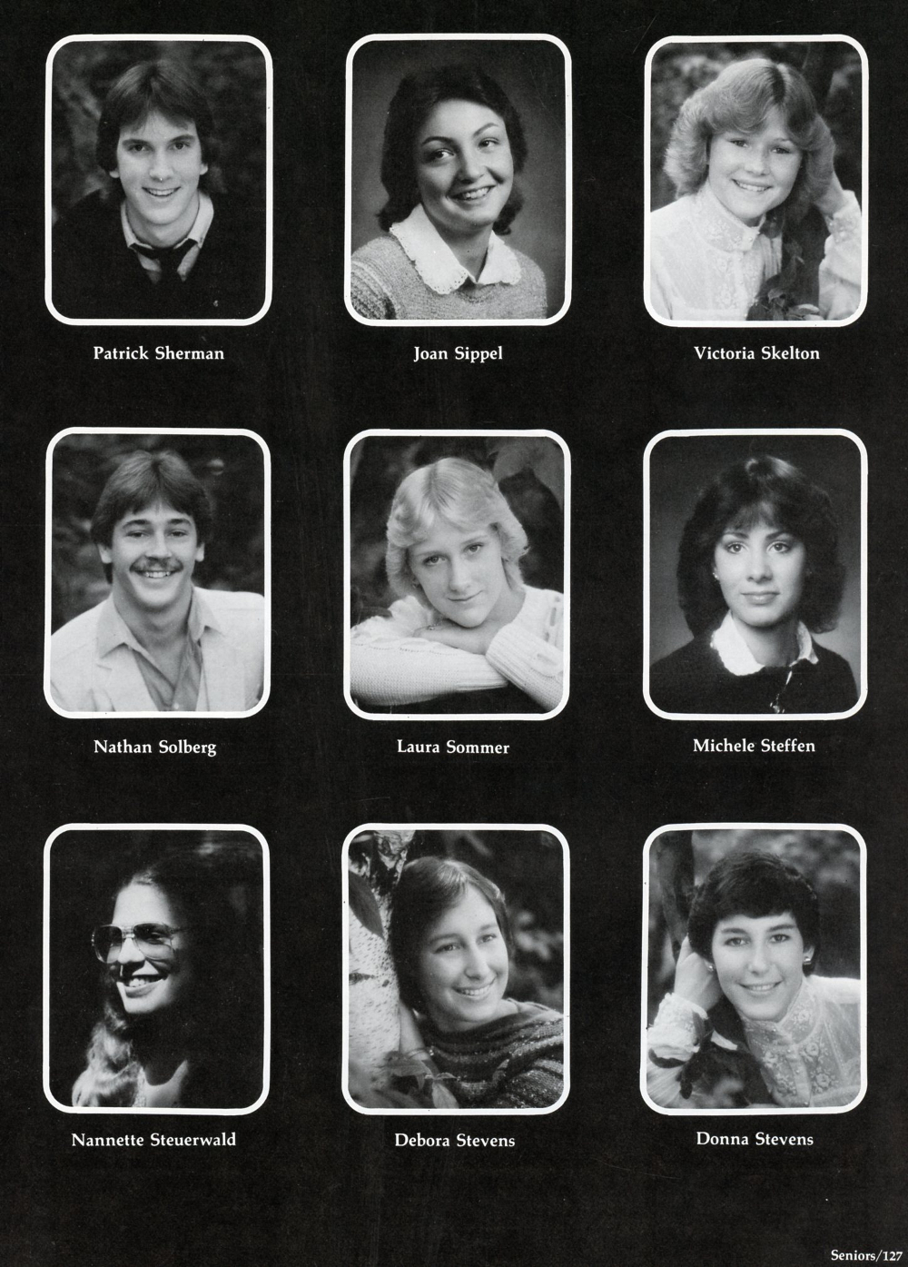 1982 Sheboygan Falls High School Yearbook, page 127: Patrick Sherman, Joan Sippel, Victoria Skelton, Nathan Solberg, Laura Sommer, Michele Steffen, Nannette Steuerwald, Deborah Stevens, Donna Stevens.