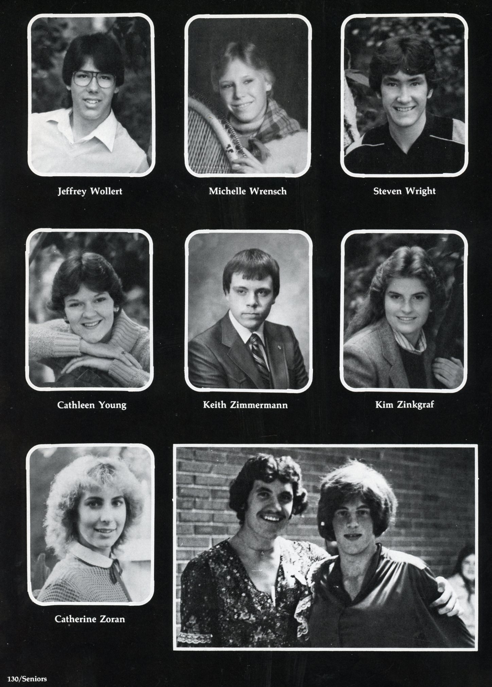 1982 Sheboygan Falls High School Yearbook, page 130: Jeffrey Wollert, Michelle Wrensch, Steven Wright, Cathleen Young, Keith Zimmermann, Kim Zinkgraf, Catherine Zoran.