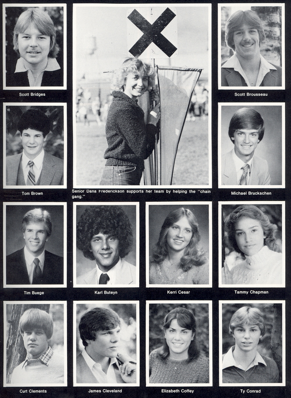1982 Sheboygan North High School, Page 113. Scott Bridges, Scott Brousseau, Tom Brown, Michael Bruckschen, Tim Buege, Karl Buteyn, Kerri Cesar, Tammy Chapman, Curt Clements, James Cleveland, Elizabeth Coffey, Ty Conrad.
