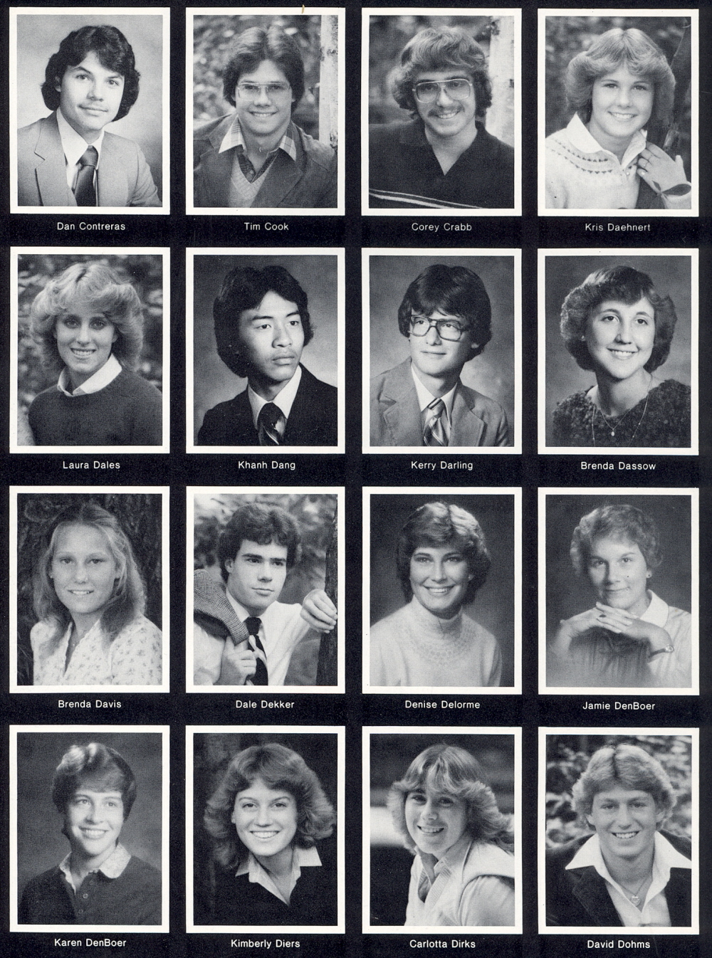 1982 Sheboygan North High School, Page 114. Dan Contreras, Tim Cook, Corey Crabb, Kris Daehnert, Laura Dales, Khanh Dang, Kerry Darling, Brenda Dassow, Brenda Davis, Dale Dekker, Denise Delorme, Jamie DenBoer, Karen DenBoer, Kimberly Diers, Carlotta Dirks, David Dohms.