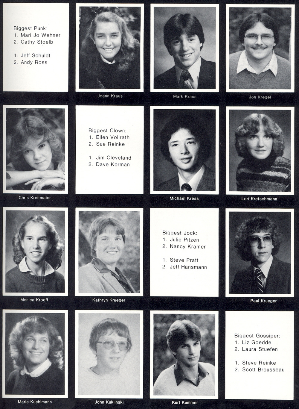 1982 Sheboygan North High School, Page 127. Joann Kraus, Mark Kraus, Jon Kregel, Chris Kreitmaier, Michael Kress, Lori Kretschmann, Monica Kroeff, Kathryn Krueger, Paul Krueger, Marie Kuehlmann, John Kuklinski, Kurt Kummer.