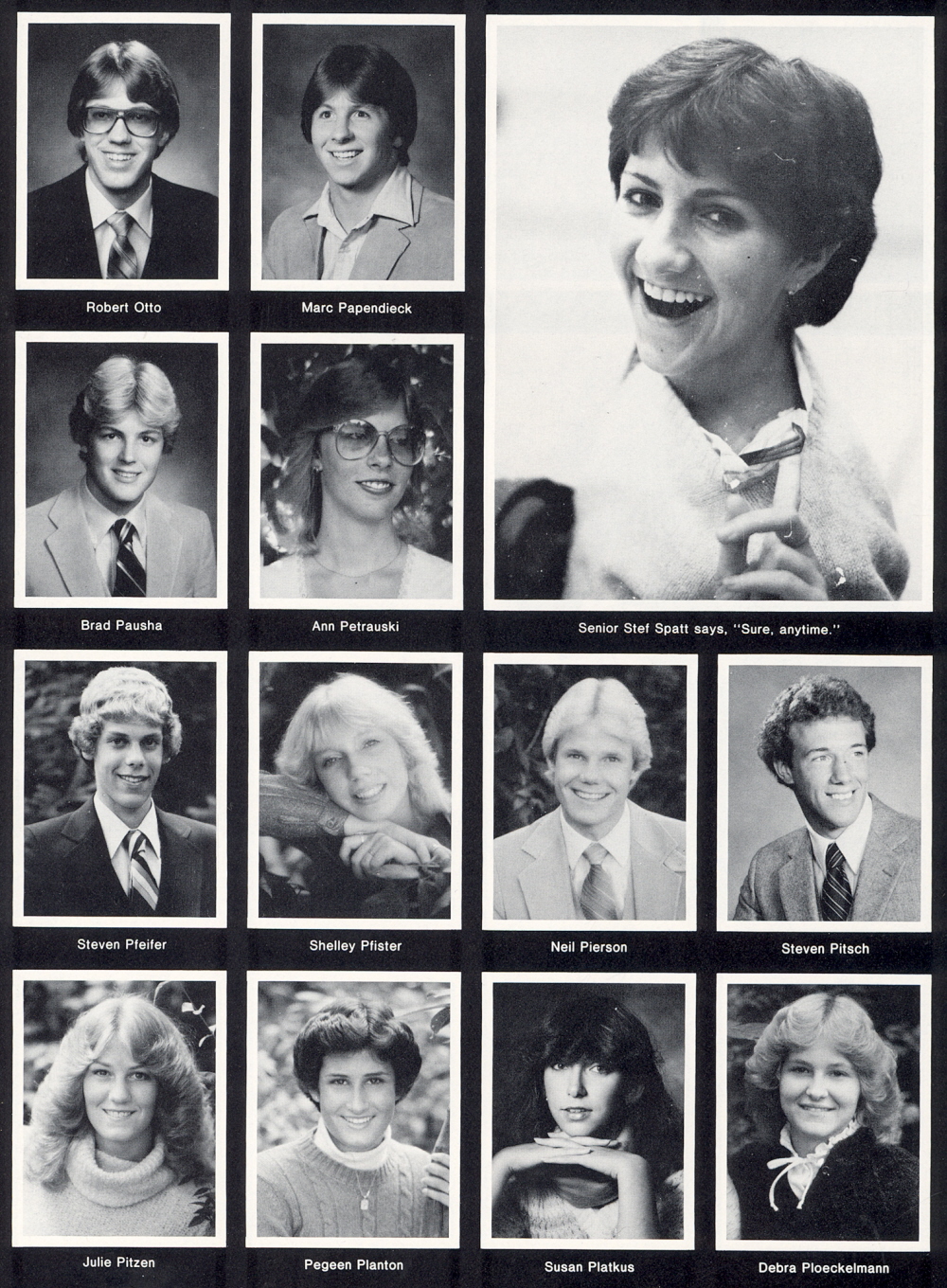 1982 Sheboygan North High School, Page 132. Robert Otto, Marc Papendieck, Brad Pausha, Ann Petrauski, Steven Pfeifer, Shelley Pfister, Neil Pierson, Steven Pitsch, Julie Pitzen, Pegeen Planton, Susan Platkus, Debra Ploeckelmann.