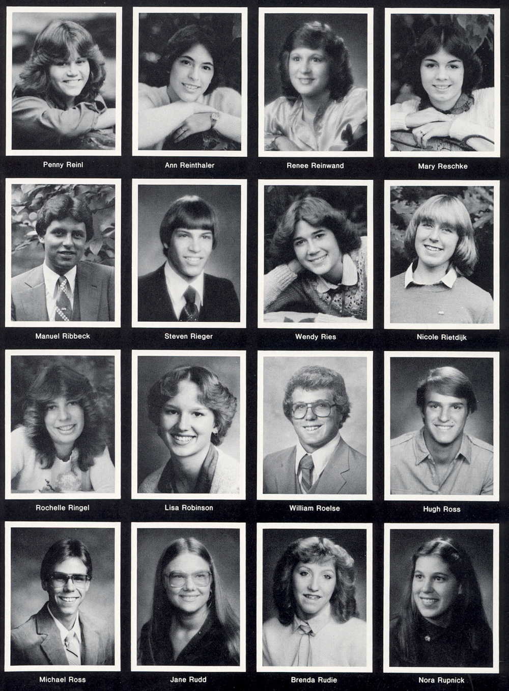 1982 Sheboygan North High School, Page 134. Penny Reinl, Ann Reinthaler, Renee Reinwand, Mary Reschke, Manuel Ribbeck, Steven Rieger, Wendy Ries, Nicole Rietdijk, Rochelle Ringel, Lisa Robinson, William Roelse, Hugh Ross, Michael Ross, Jane Rudd, Brenda Rudie, Nora Rupnick.
