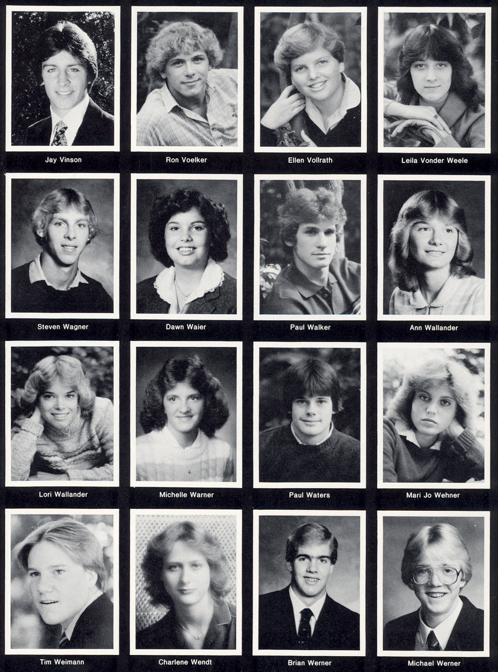 1982 Sheboygan North High School, Page 142. Jay Vinson, Ron Voelker, Ellen Vollrath, Leila Vonder Weele, Steven Wagner, Dawn Waier, Paul Walker, Ann Wallander, Lori Wallander, Michelle Warner, Paul Waters, Mari Jo Wehner, Tim Weimann, Charlene Wendt, Brian Werner, Michael Werner.
