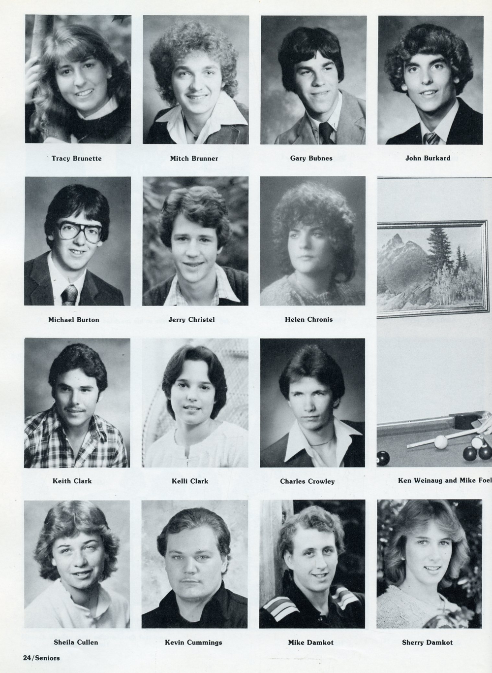 1982 Sheboygan South High School, Page 24: Tracy Brunette, Mitch Brunner, Gary Bubnes, John Burkard, Michael Burton, Jerry Christel, Helen Chronis, Keith Clark, Kelli Clark, Charles Crowley, Sheila Cullen, Kevin Cummings, Mike Damkot, Sherry Damkot.