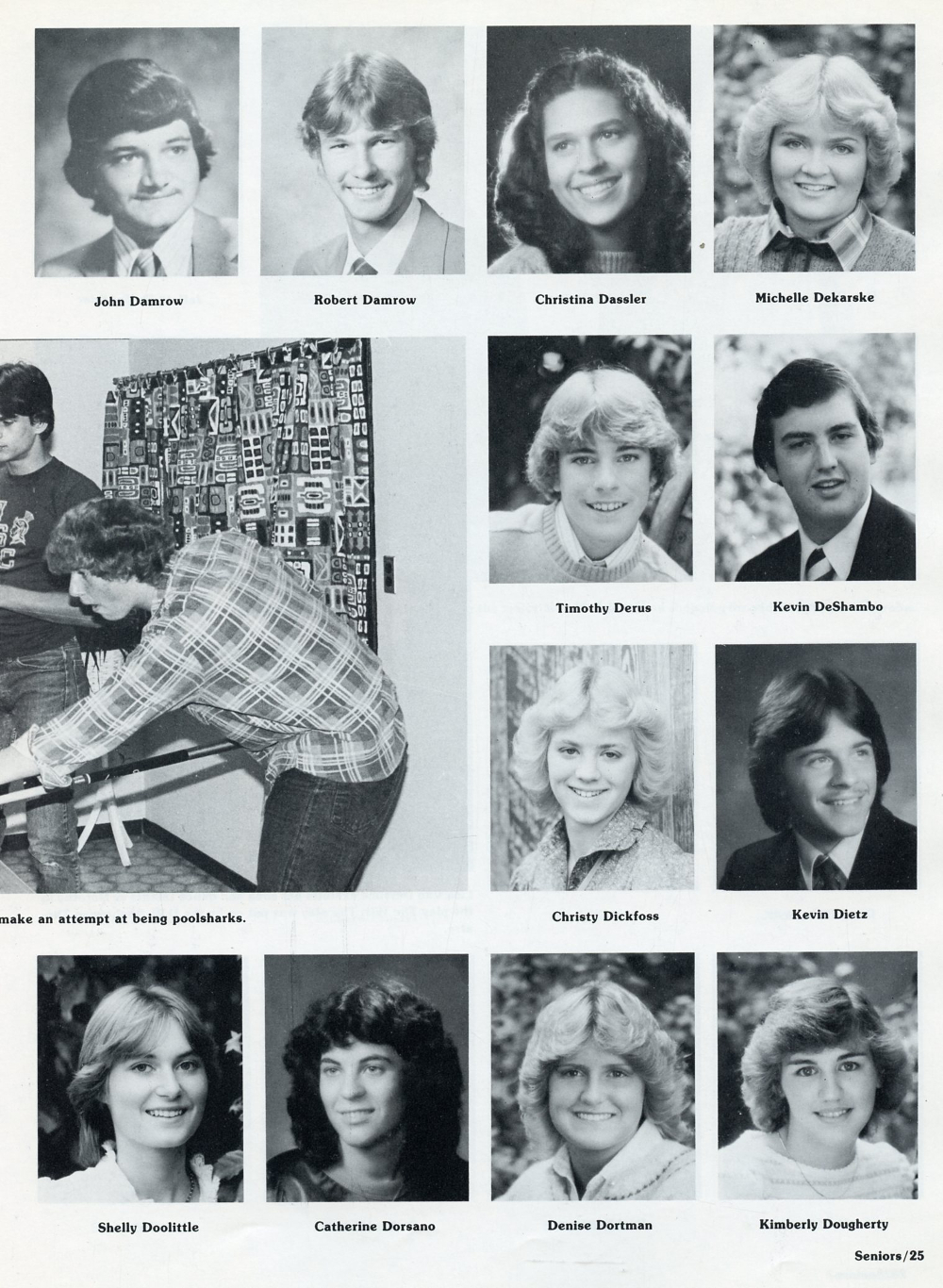 1982 Sheboygan South High School, Page 25: John Damrow, Robert Damrow, Christina Dassler, Michele Dekarske, Timothy Derus, Kevin DeShambo, Christy Dickfoss, Kevin Dietz, Shelly Doolittle, Catherine Dorsano, Denise Dortman, Kimberly Dougherty.