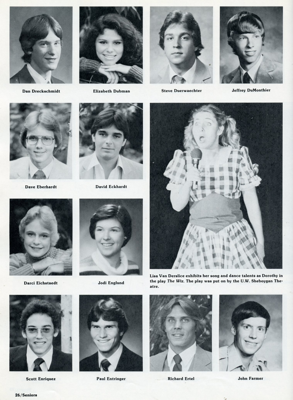1982 Sheboygan South High School, Page 26: Dan Dreckschmidt, Elizabeth Dubman, Steve Duerwaechter, Jeffrey DuMonthier, Dave Eberhardt, David Eckhardt, Darci Eichstaedt, Jodi Englund, Scott Enriquez, Paul Entringer, Richard Ertel, John Farmer.