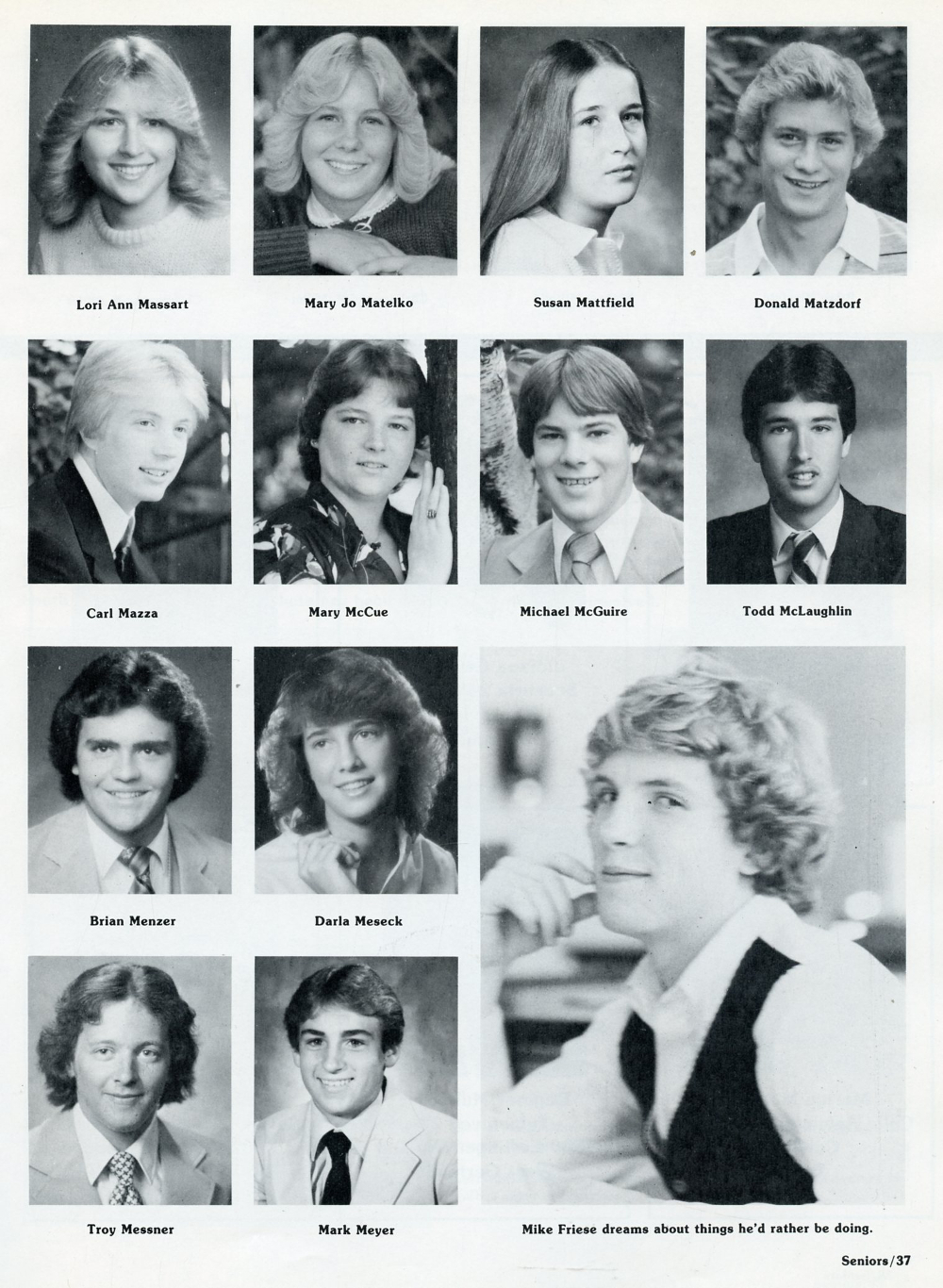 1982 Sheboygan South High School, Page 37: Lori Ann Massart, Mary Jo Matelko, Susan Mattfield, Donald Matzdorf, Carl Mazza, Mary McCue, Michael McGuire, Todd McLaughlin, Brian Menzer, Darla Meseck, Troy Messner, Mark Meyer.