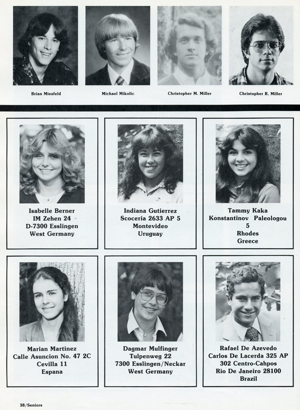 1982 Sheboygan South High School, Page 38: Brian Miesfeld, Michael Mikolic, Christopher M. Miller, Christopher R. Miller, Isabelle Berner, Indiana Gutierrez, Tammy Kaka, Marian Martinez, Dagmar Mulfinger, Rafael De Azevedo.