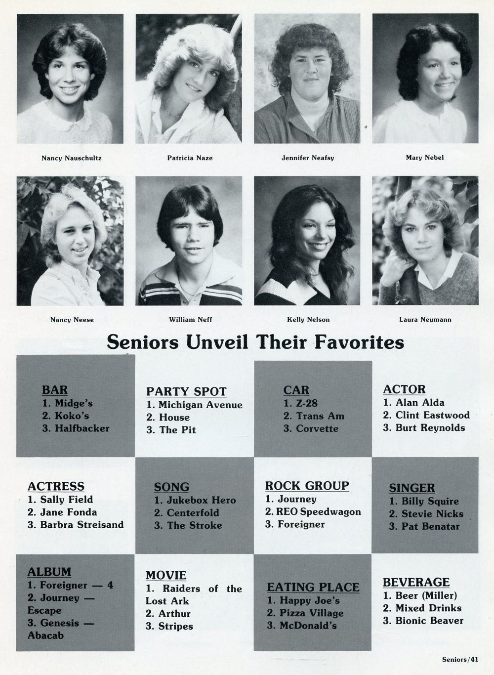 1982 Sheboygan South High School, Page 41: Nancy Nauschultz, Patricia Naze, Jennifer Neafsy, Mary Nebel, Nancy Neese, William Neff, Kelly Nelson, Laura Neumann.