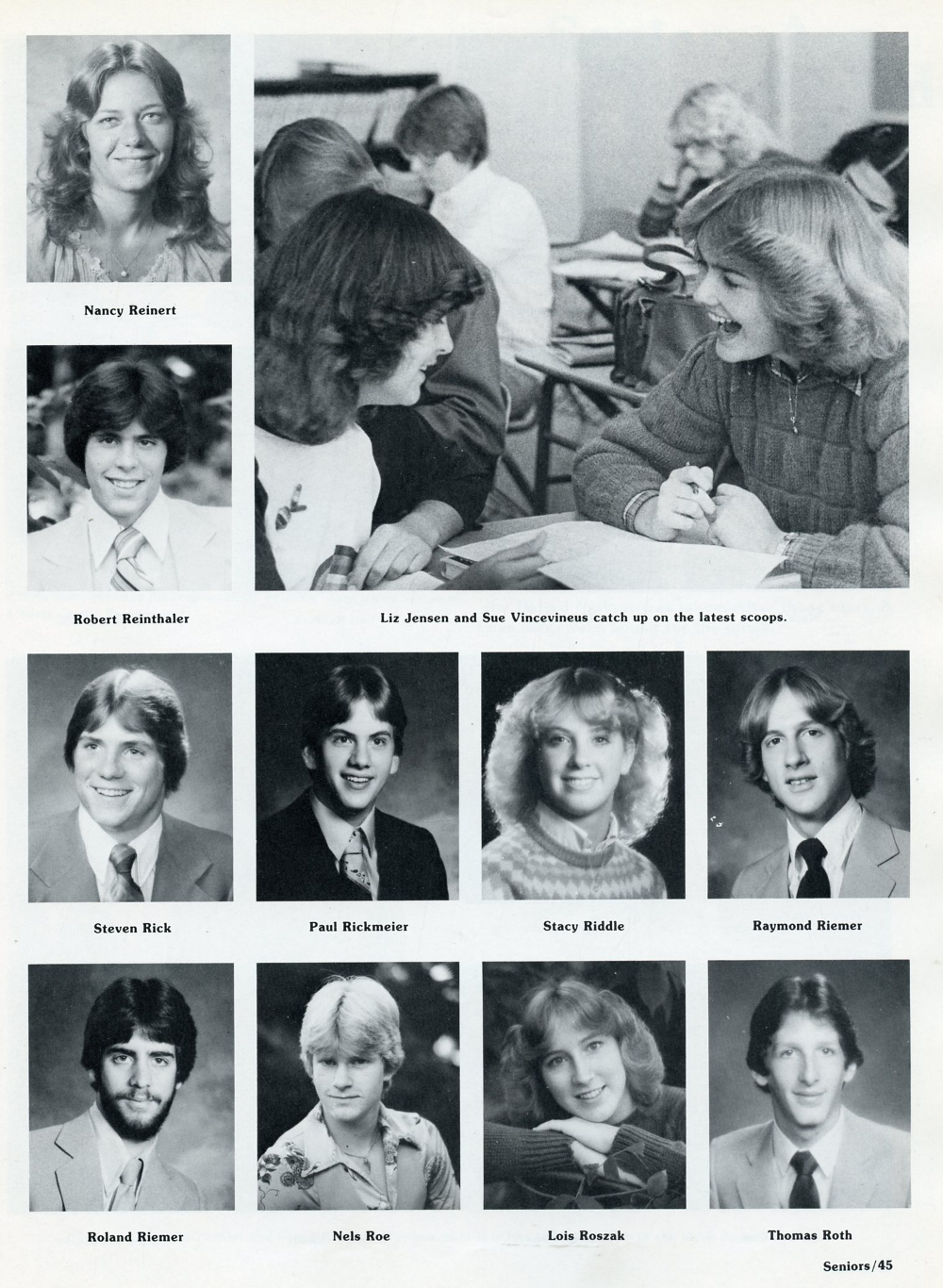 1982 Sheboygan South High School, Page 45: Nancy Reinert, Robert Reinthaler, Steven Rick, Paul Rickmeier, Stacy Riddle, Raymond Riemer, Roland Riemer, Nels Roe, Lois Roszak, Thomas Roth.