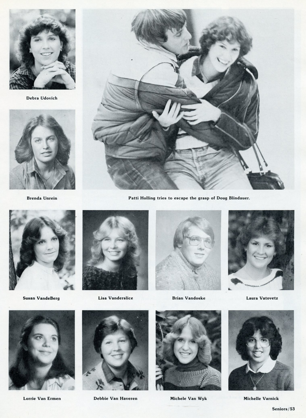1982 Sheboygan South High School, Page 53: Debra Udovich, Brenda Unrein, Susan VandeBerg, Lisa Venderslice, Brian Vandoske, Laura Vatovetz, Lorrie Van Ermen, Debbie Van Haveren, Michele Van Wyk, Michelle Varnick.