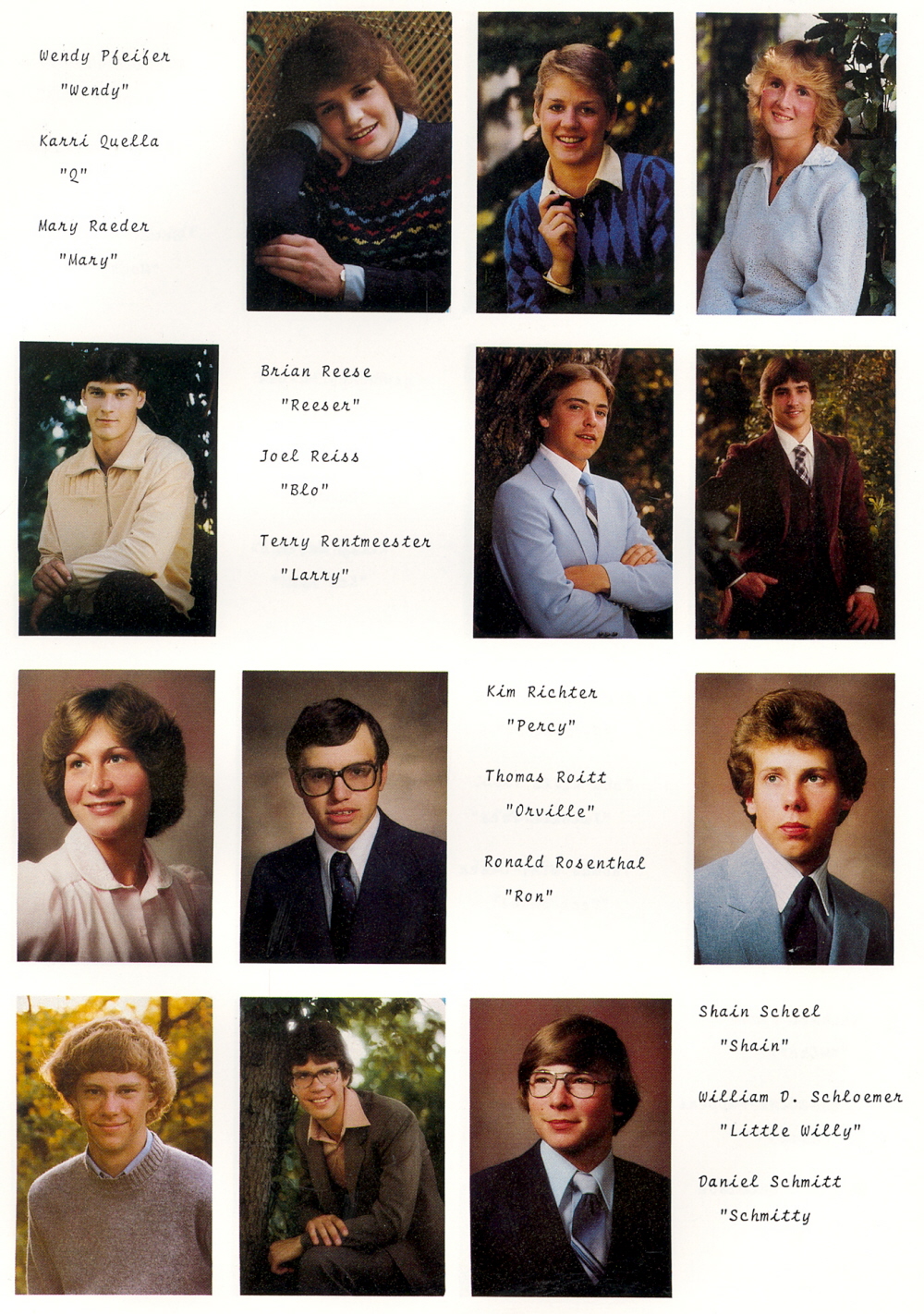1983 Elkhart Lake High School, Page 102. Wendy Pfeifer, Karri Quella, Mary Raeder, Brian Reese, Joel Reiss, Terry Rentmeester, Kim Richter, Thomas Roitt, Ronald Rosenthal, Shain Scheel, William Schloemer, Daniel Schmitt.