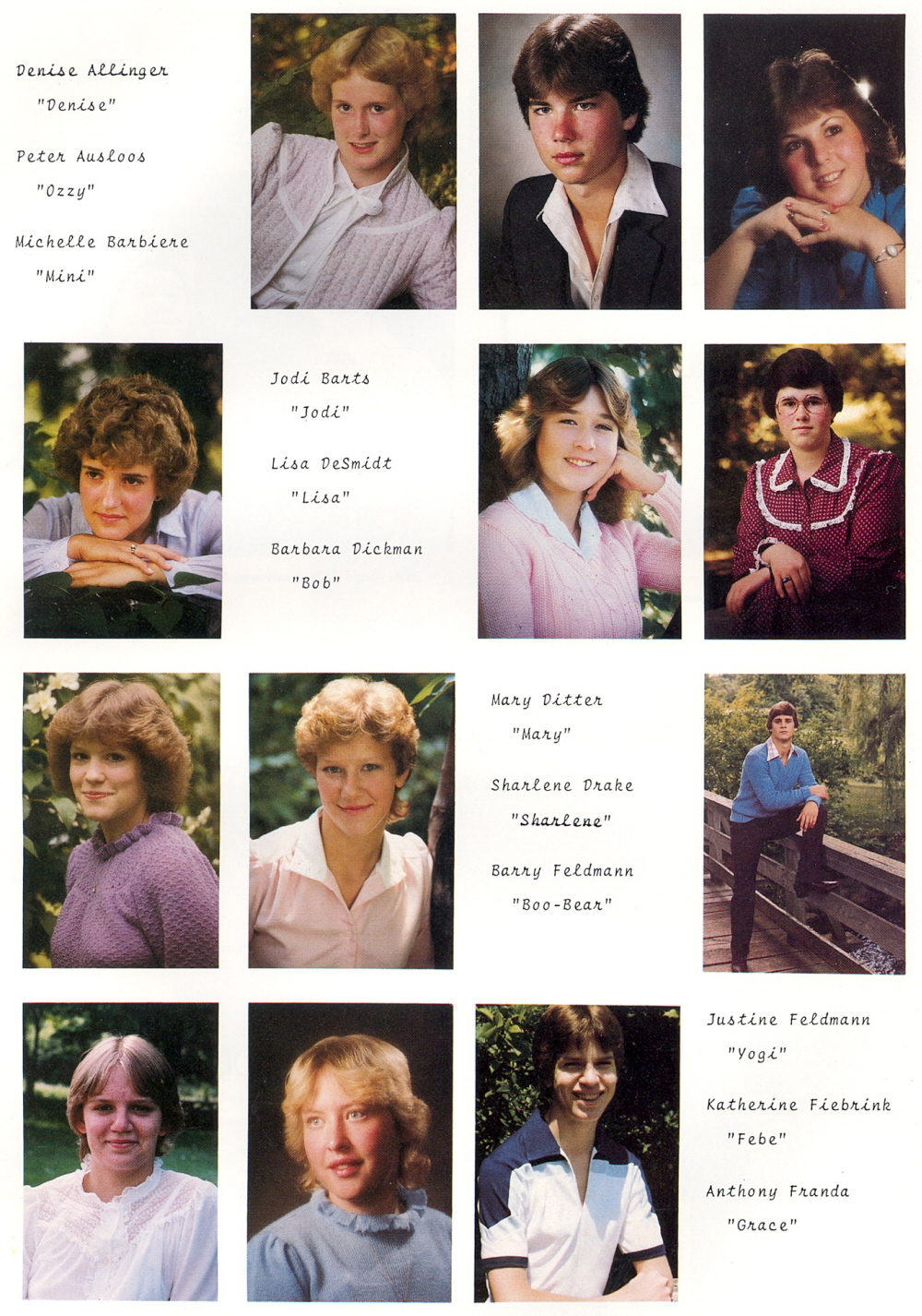 1983 Elkhart Lake High School, Page 98. Denise Allinger, Peter Ausloos, Michelle Barbiere, Jodi Barts, Lisa DeSmidt, Barbara Dickman, Mary Ditter, Sharlene Drake, Barry Feldmann, Justine Feldmann, Katherine Fiebrink, Anthony Franda.