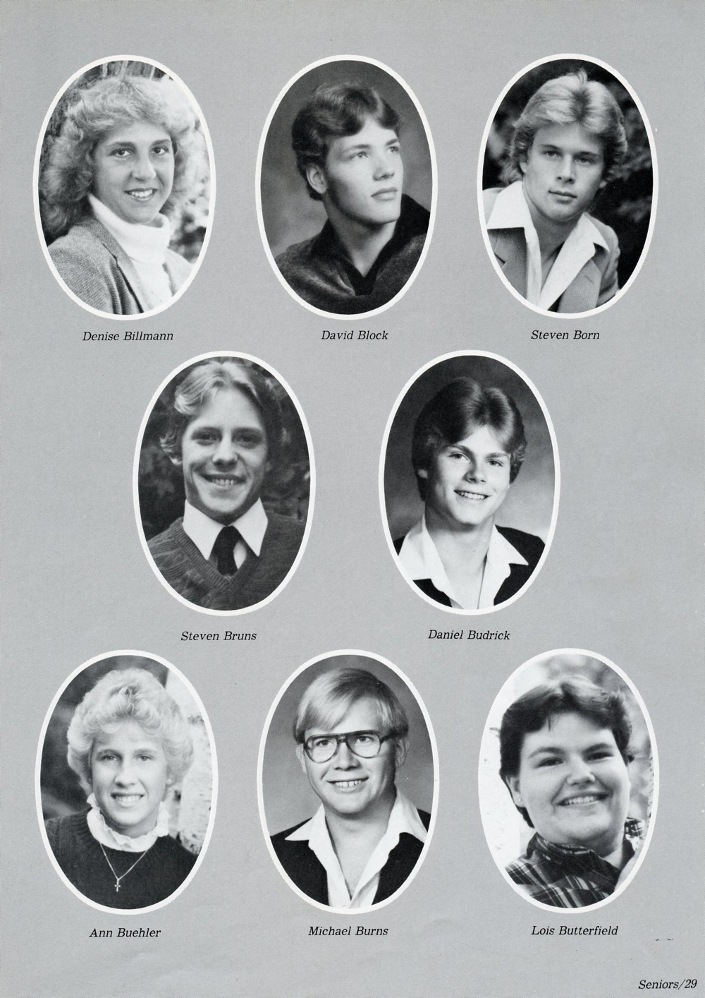 1983 Sheboygan Falls High School Yearbook, Page 29: Denise Billmann, David Block, Steven Born, Steven Bruns, Daniel Budrick, Ann Buehler, Michael Burns, Lois Butterfield.