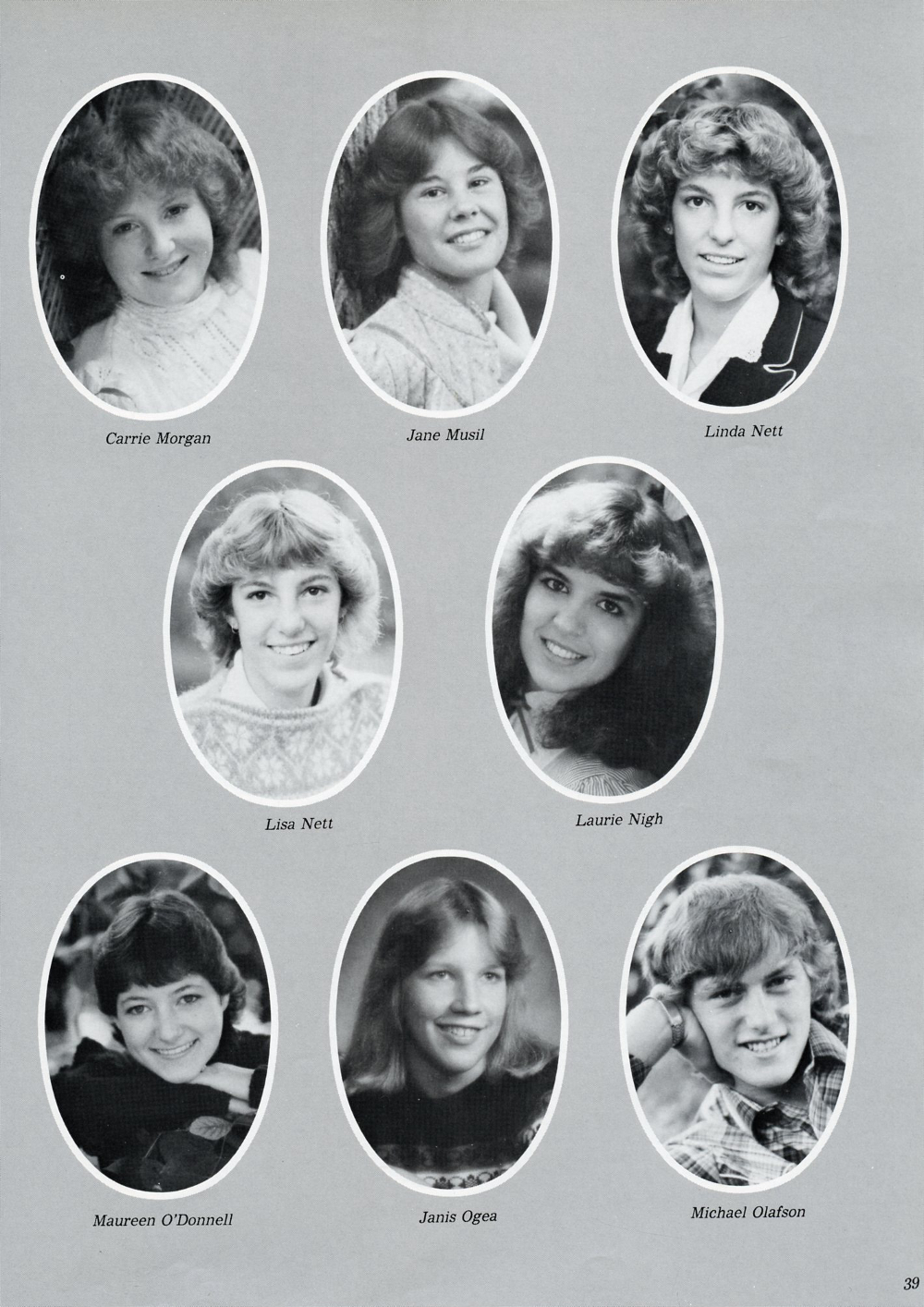 1983 Sheboygan Falls High School Yearbook, Page 39: Carrie Morgan, Jane Musil, Linda Nett, Lisa Nett, Laurie Nigh, Maureen O'Donnell, Janis Ogea, Michael Olafson.