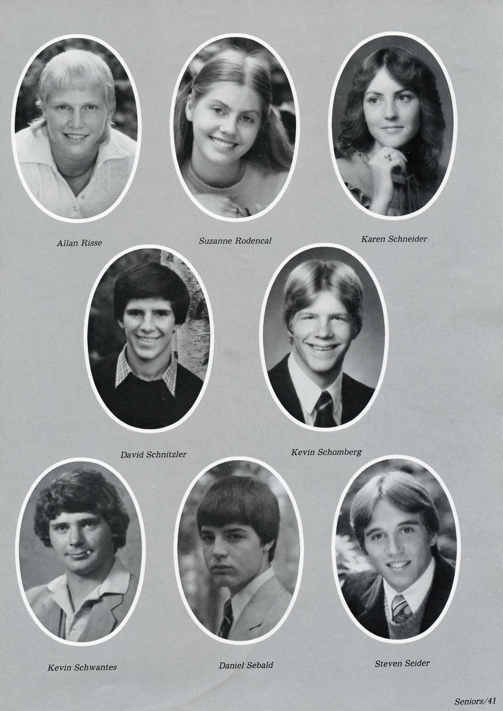 1983 Sheboygan Falls High School Yearbook, Page 41: Allan Risse, Suzanne Rodencal, Karen Schneider, David Schnitzler, Kevin Schomberg, Kevin Schwantes, Daniel Sebald, Steven Seider.