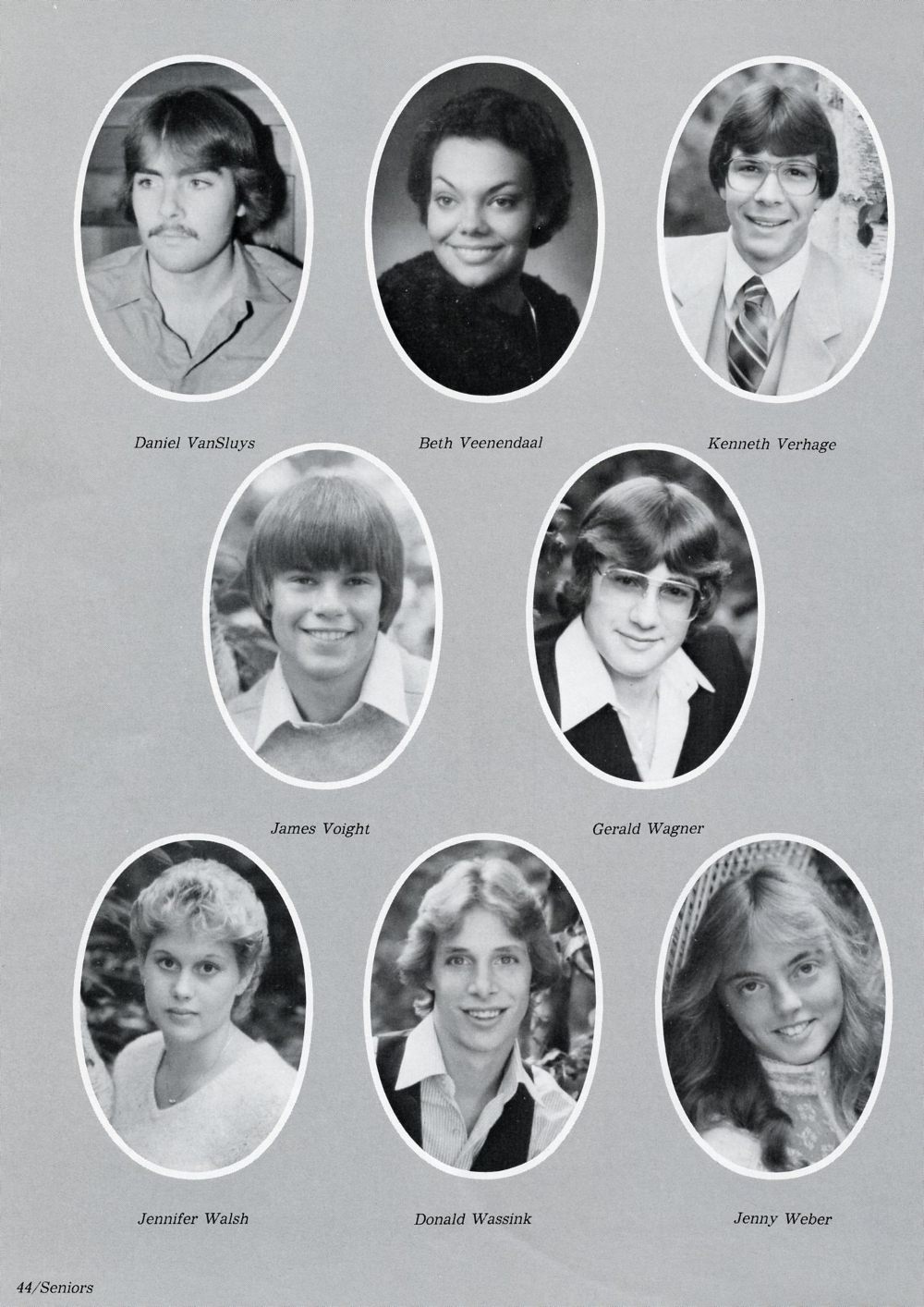 1983 Sheboygan Falls High School Yearbook, Page 44: Daniel VanSluys, Beth Veenendaal, Kenneth Verhage, James Voight, Gerald Wagner, Jennifer Walsh, Donald Wassink, Jenny Weber.