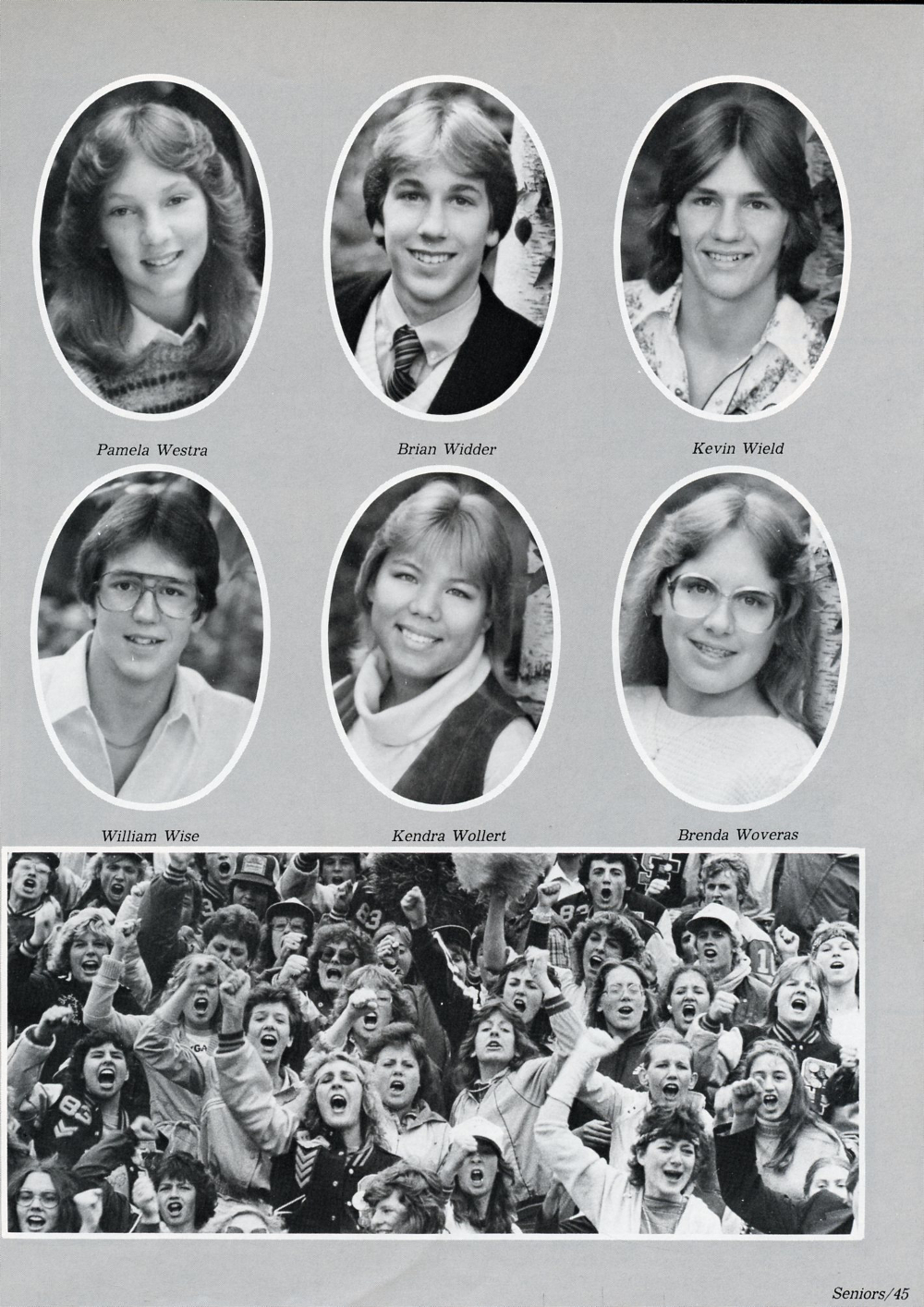 1983 Sheboygan Falls High School Yearbook, Page 45: Pamela Westra, Brian Widder, Kevin Wield, William Wise, Kendra Wollert, Brenda Woveras.