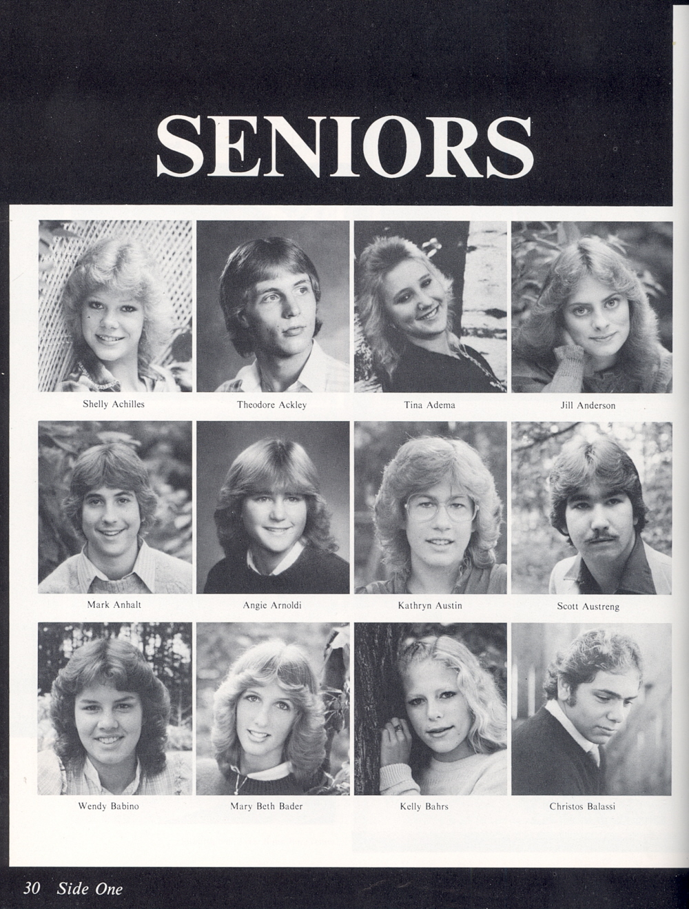 1983 Sheboygan North High School, Page 30: Shelly Achilles, Theodore Ackley, Tina Adema, Jill Anderson, Mark Anhalt, Angie Arnoldi, Kathryn Austin, Scott Austreng, Wendy Babino, Mary Beth Bader, Kelly Bahrs, Christos Balassi.