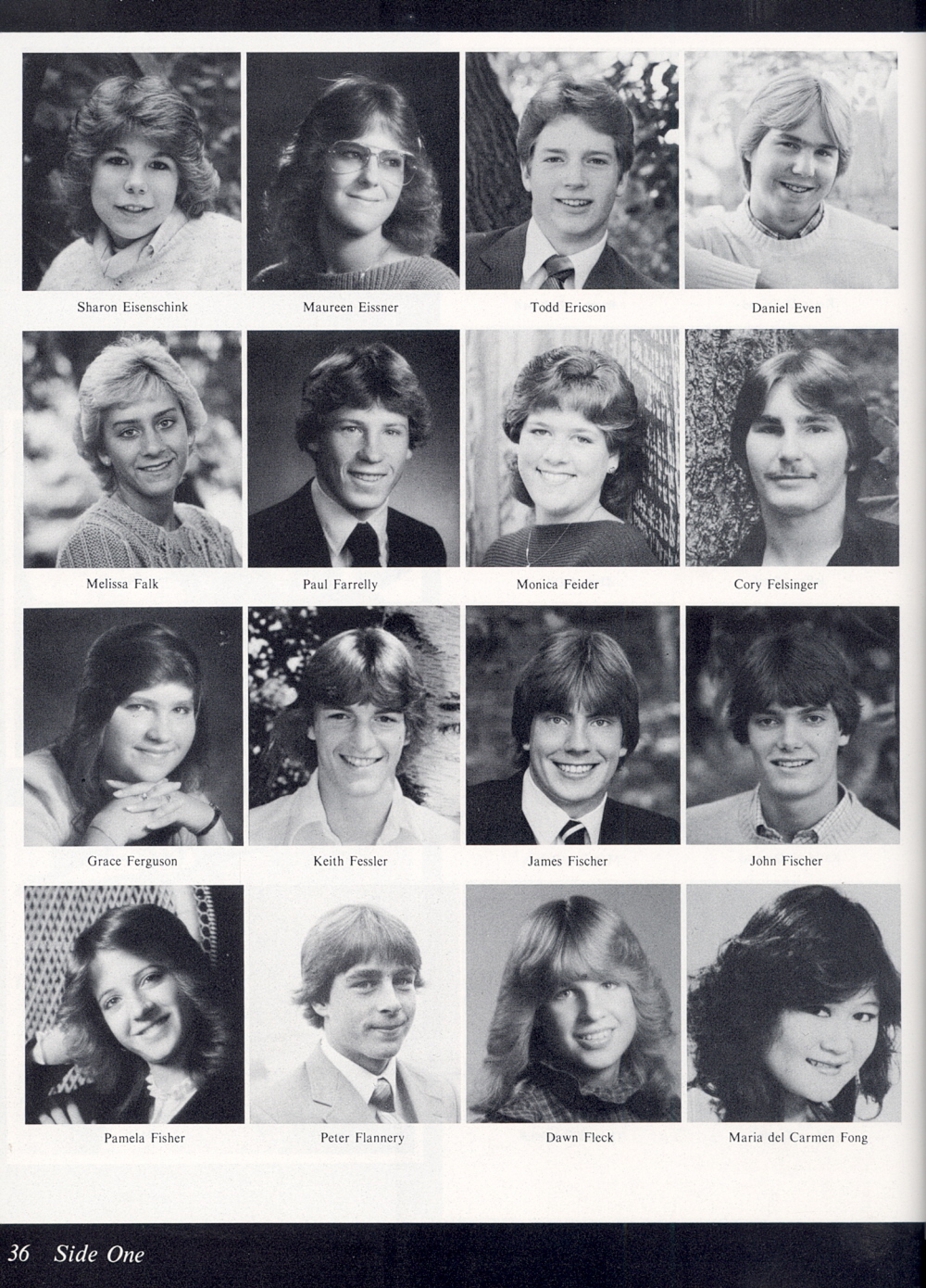 High School, Page 36: Sharon Eisenschink, Maureen Eissner, Todd Ericson, Daniel Even, Melissa Falk, Paul Farrelly, Monica Feider, Cory Felsinger, Grace Ferguson, Keith Fessler, James Fischer, John Fischer, Pamela Fisher, Peter Flannery, Dawn Fleck, Maria del Carmen Fong.