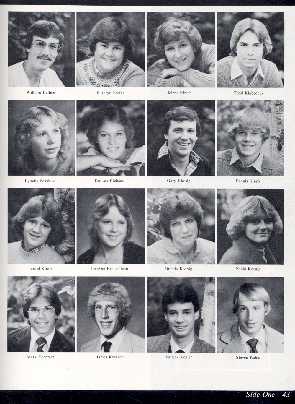 High School, Page 43: William Kellner, Kathryn Kiefer, Jolene Kirsch, Todd Klabechek, Lynette Kleckner, Kirsten Klefstad, Gary Klessig, Dennis Klunk, Laurel Klunk, LeeAnn Knickelbein, Brenda Koenig, Robin Koenig, Mark Koeppler, James Koerber, Patrick Kogler, Steven Kohls.